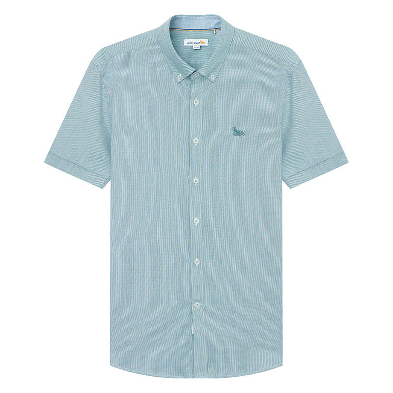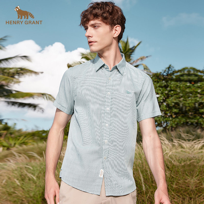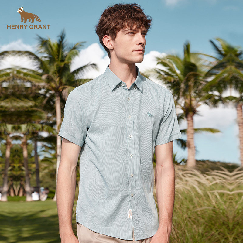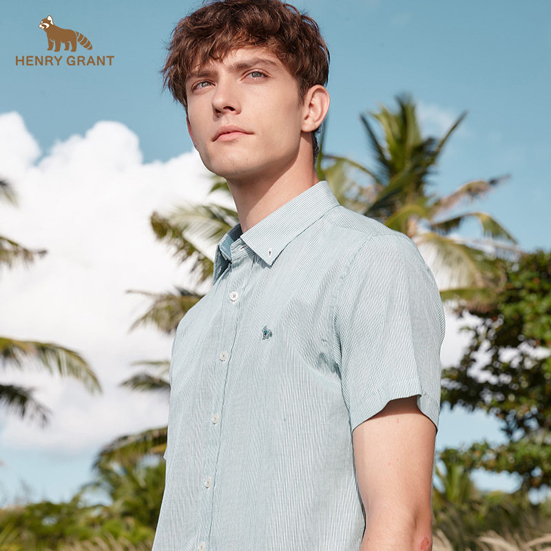 亨利格兰小熊猫夏季新品男英伦休闲条纹尖领短袖衬衫轻薄时尚衬衣