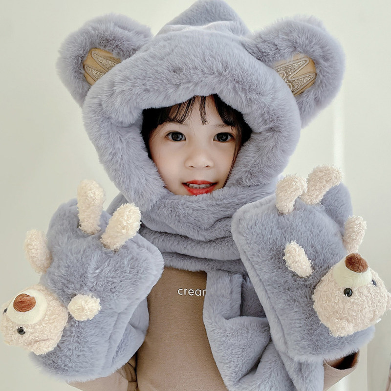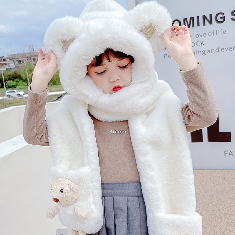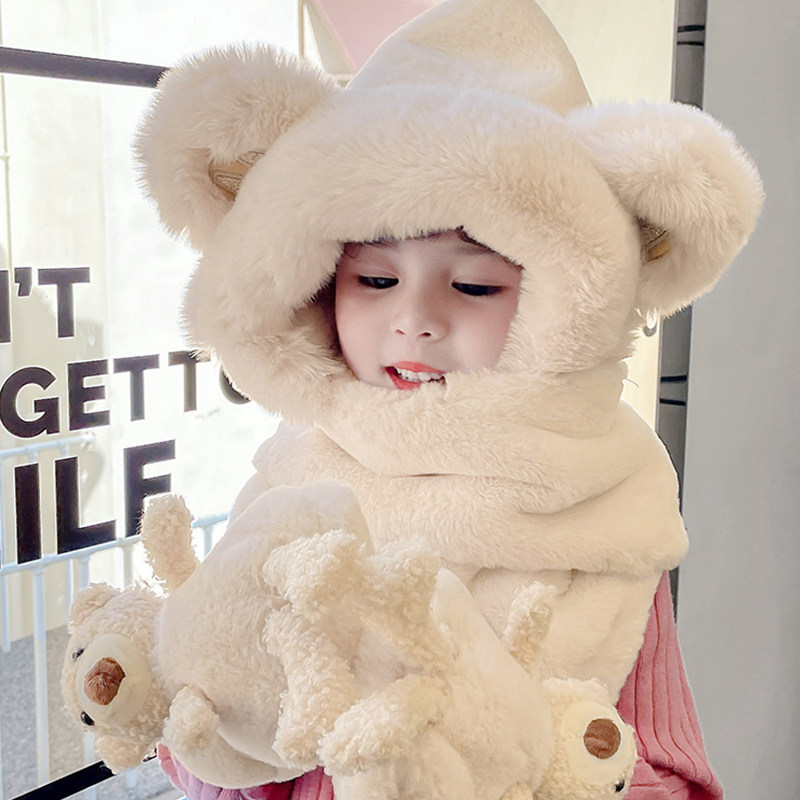 尼多熊儿童帽子围巾一体冬季防风帽宝宝毛绒护耳帽女童加厚保暖帽