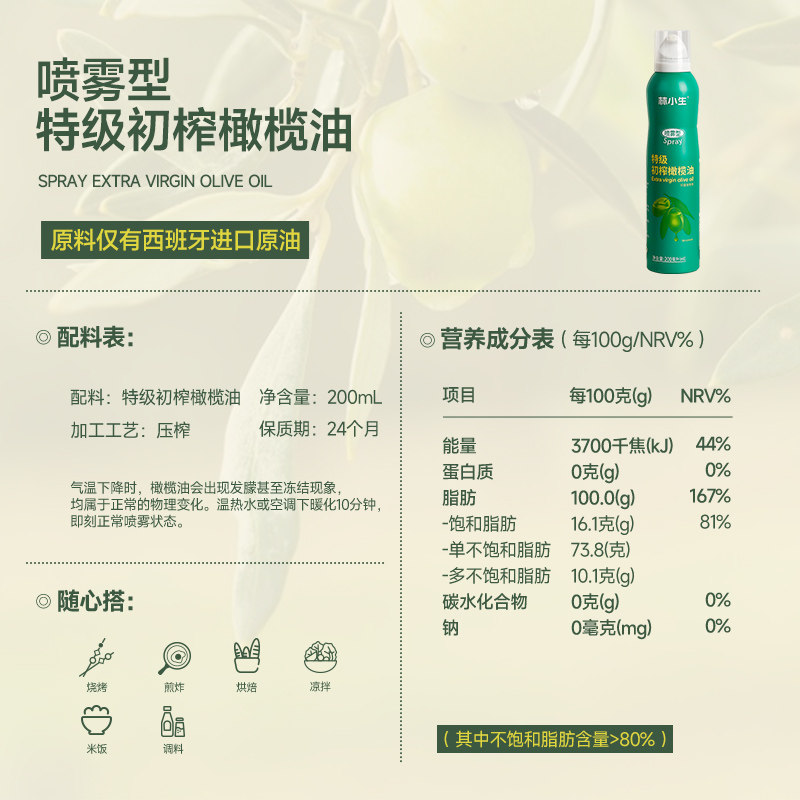 林小生特级初榨喷雾橄榄油200ml进口低健身脂食用油卡脂沙拉家用