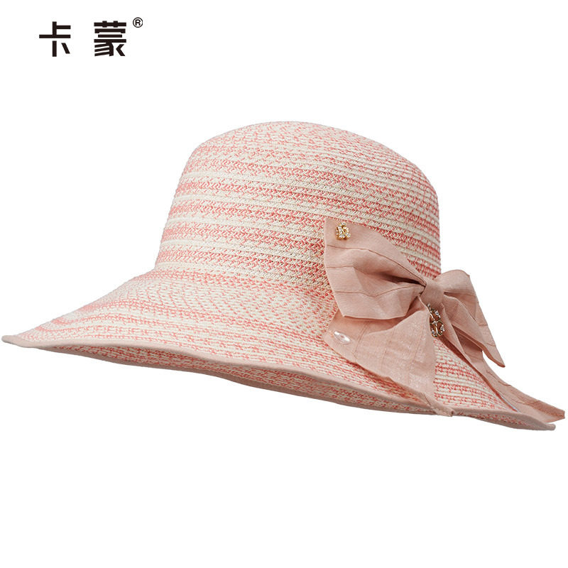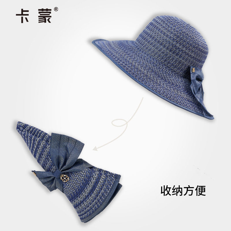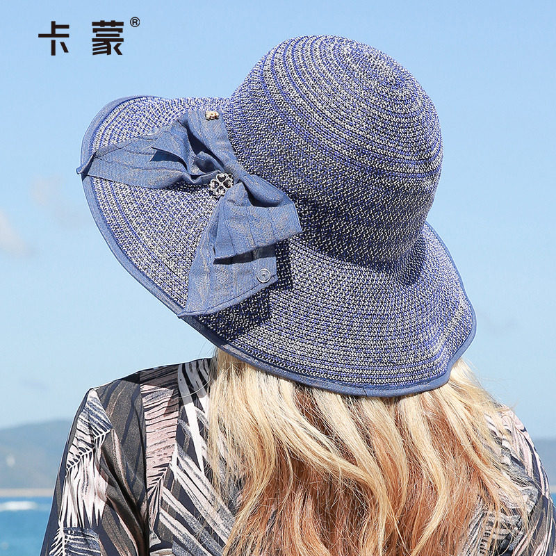 卡蒙蝴蝶结水钻可折叠草帽女夏沙滩草编太阳帽大头围防晒遮阳帽