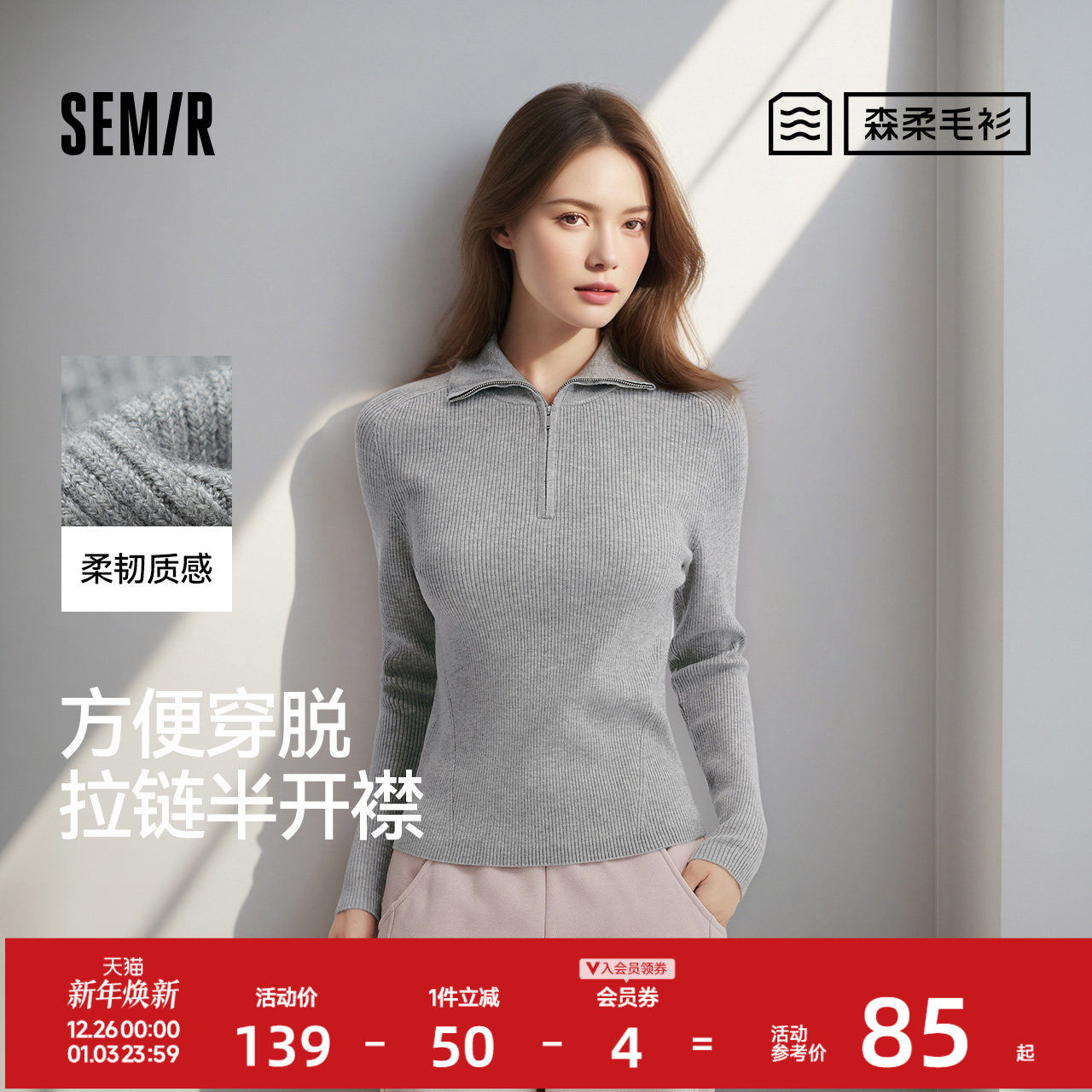 森柔毛衫|森马毛衣女纯色冬季2024新款紧身打底衫翻领毛衫灰色