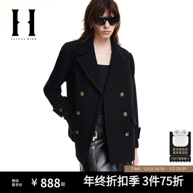 SEASON HIGH秋冬舒适百搭时尚出街简约潮流黑色毛呢大衣外套女装
