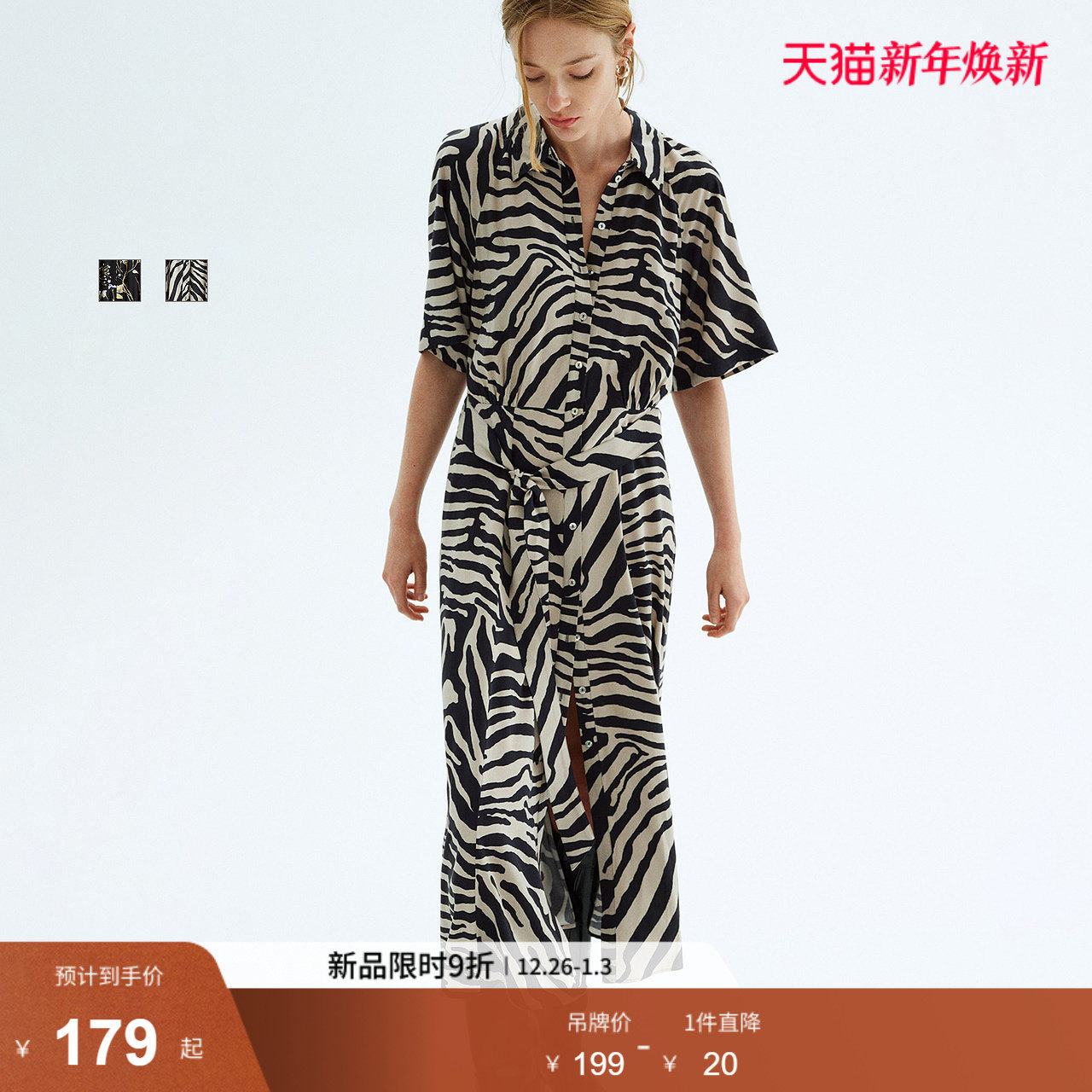 HM女装连衣裙2025冬季新装腰部系带衬衫式植物印花长裙1217576