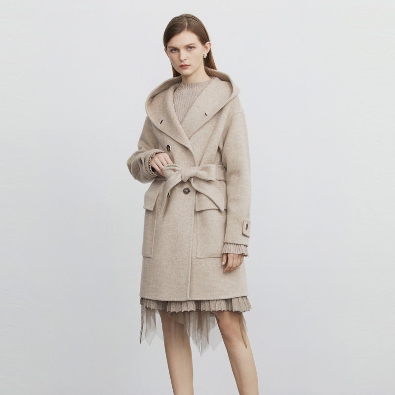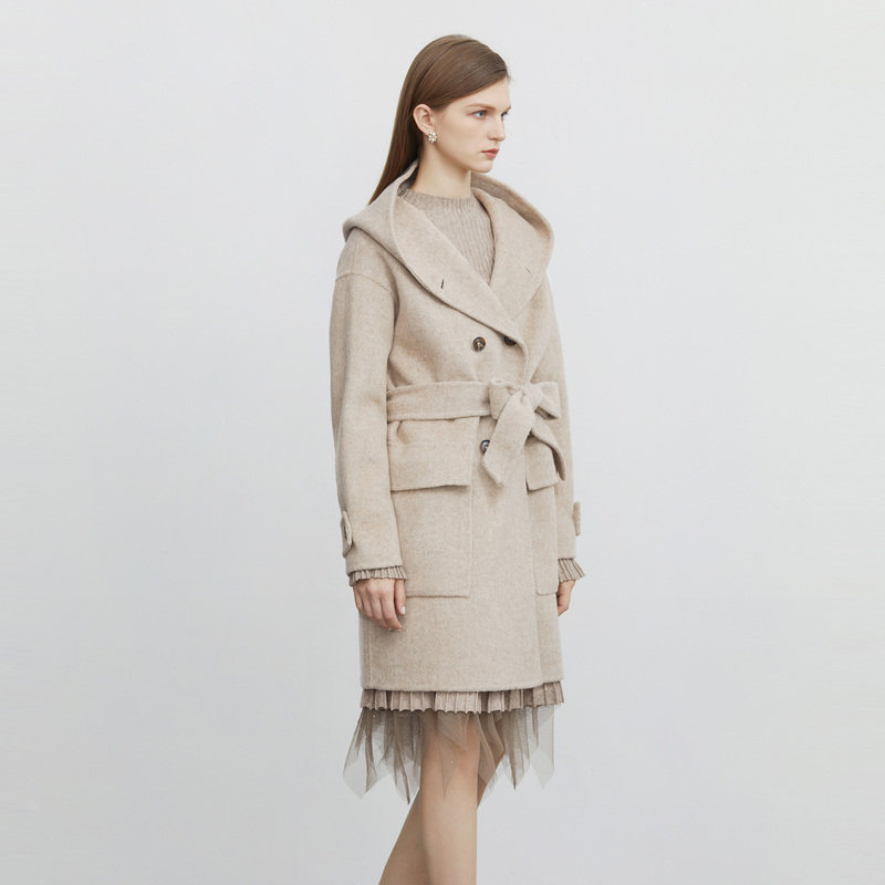 sdeer圣迪奥女装高领连帽收腰肌理毛呢大衣S22482524