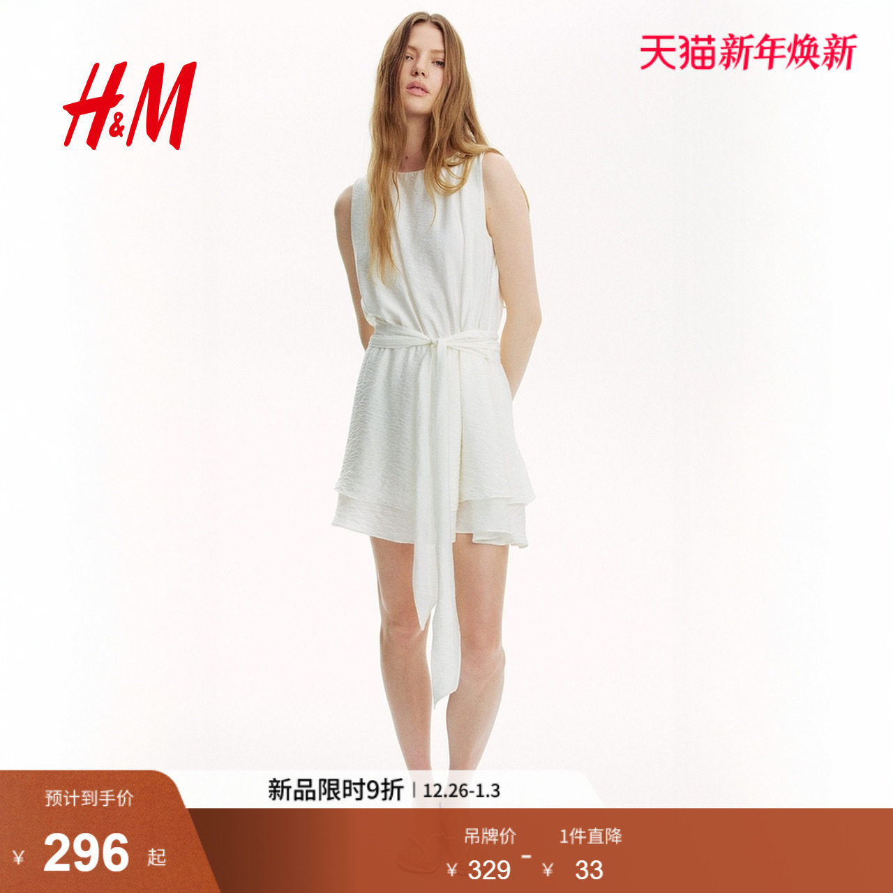 HM女装千金风连衣裙2025冬季新款腰部系带收腰通勤连身裙1291998