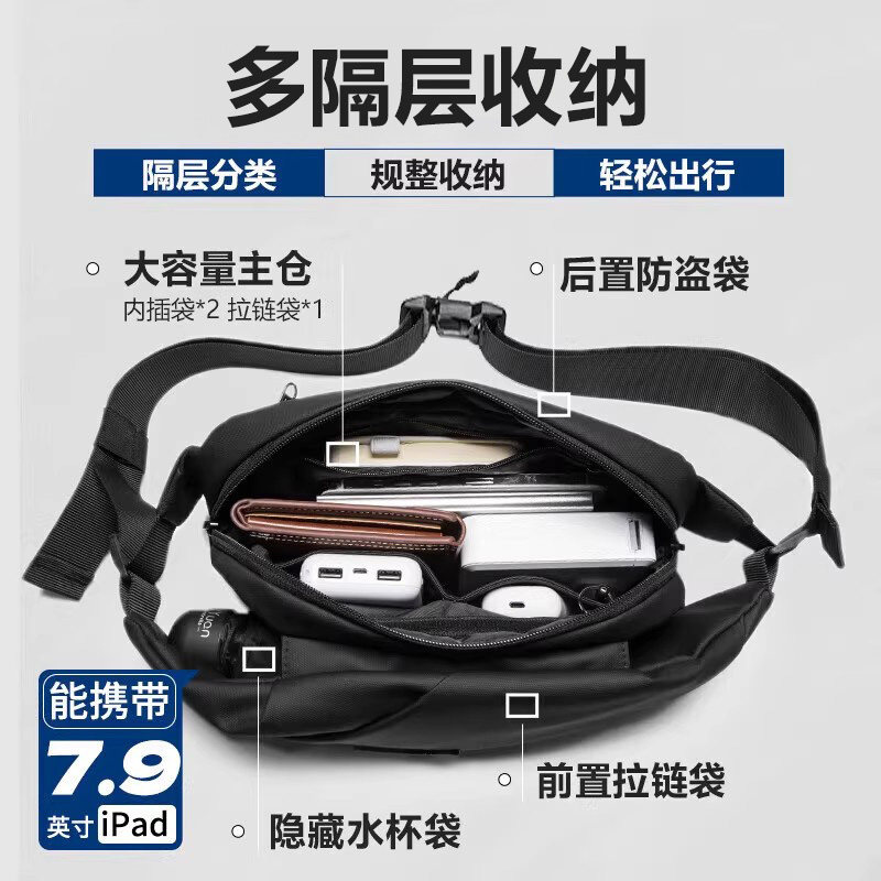 2025新款男士斜挎包防水运动单肩包休闲大容量胸包磁吸扣通勤时尚