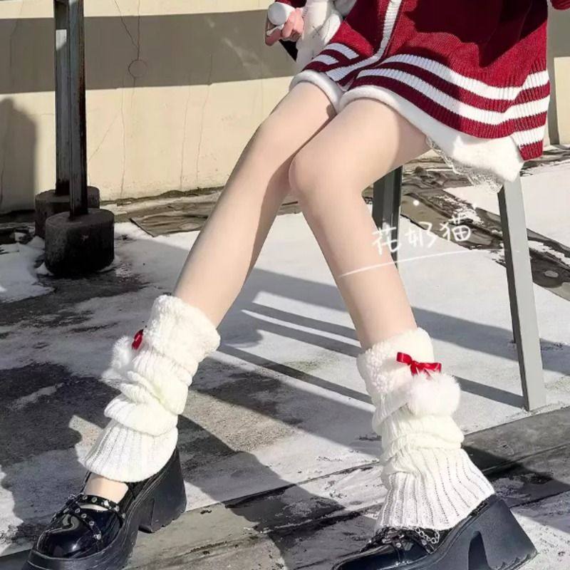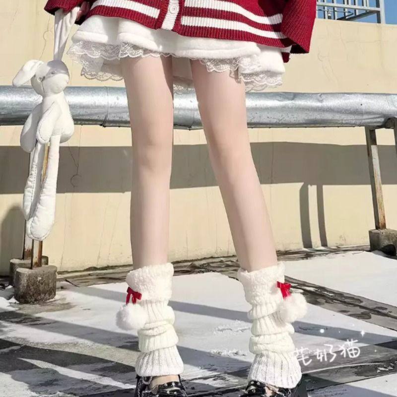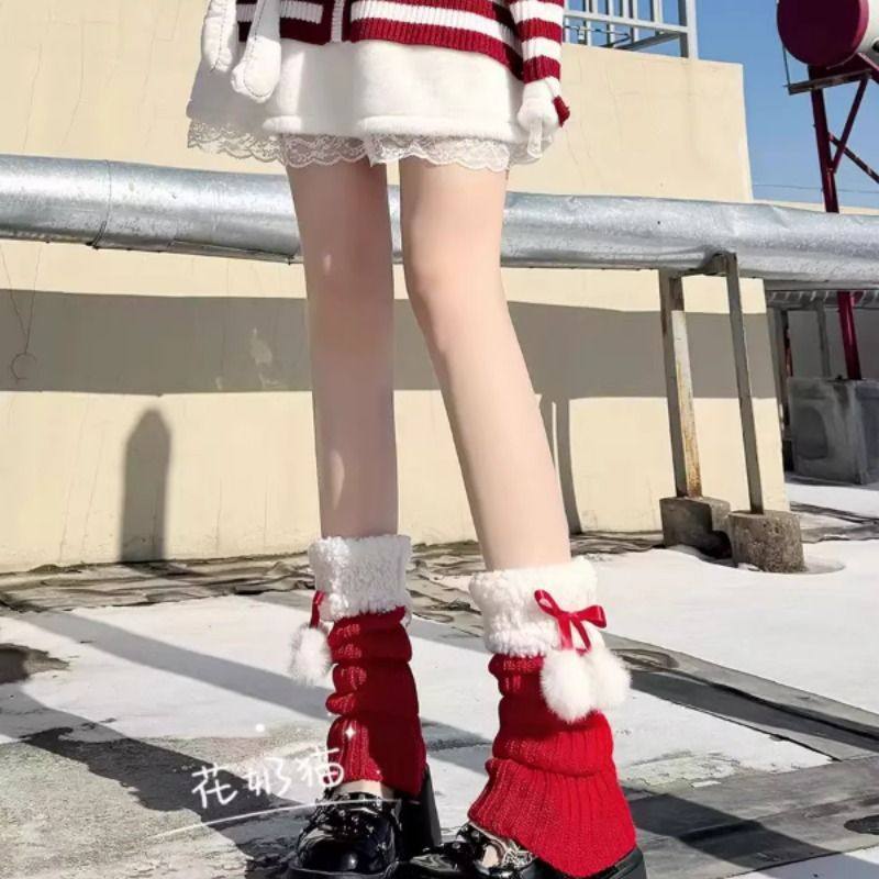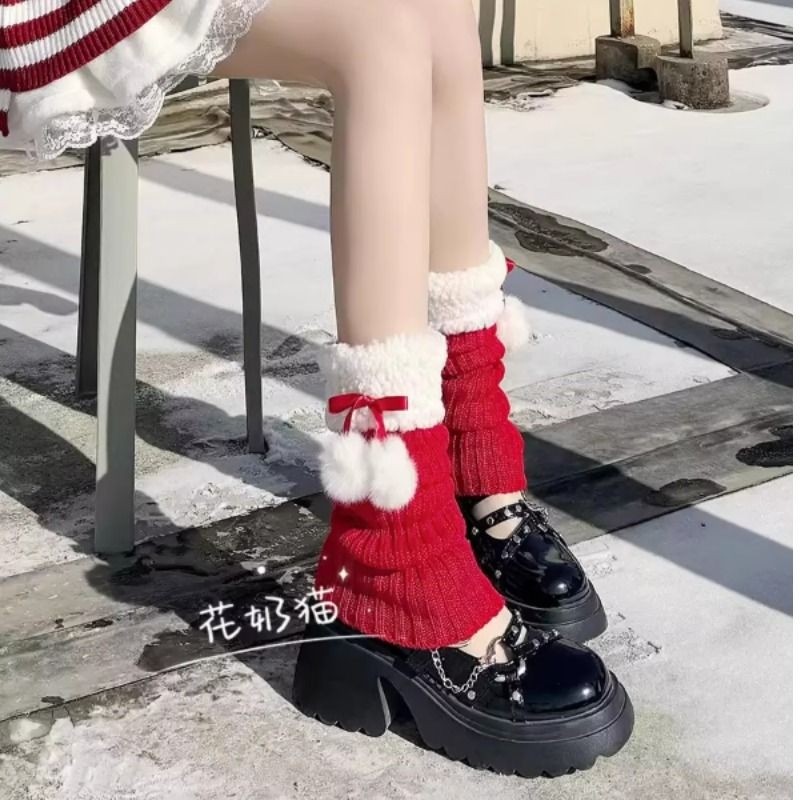 新年圣诞红色腿套女针织袜套可爱毛球球中筒袜子保暖Lolita堆堆袜