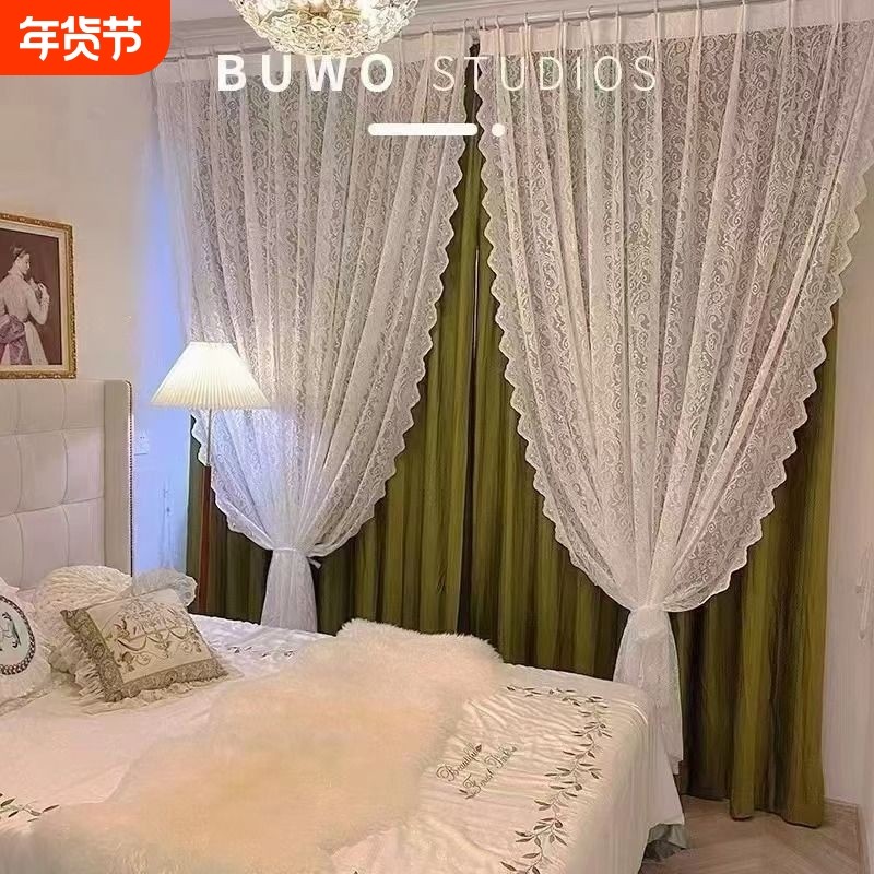 法式蕾丝窗纱帘客厅白纱窗帘透光不透人卧室飘窗免打孔钉珠凤尾纱
