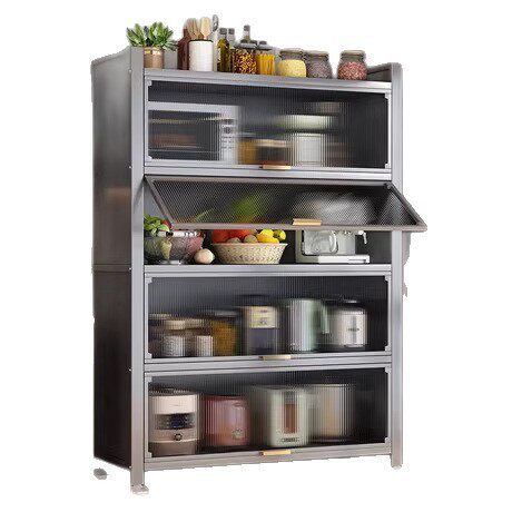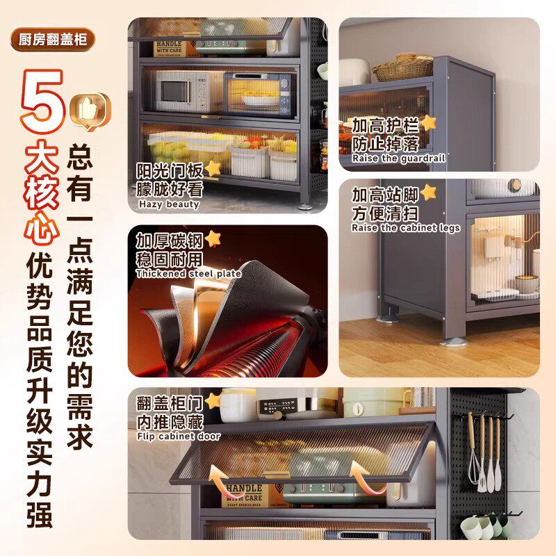 厨房多功能置物架落地多层家用防尘收纳柜微波炉橱柜带门碗柜铁皮