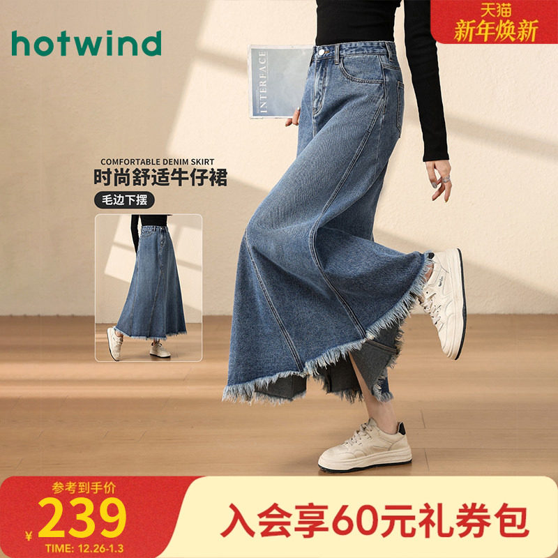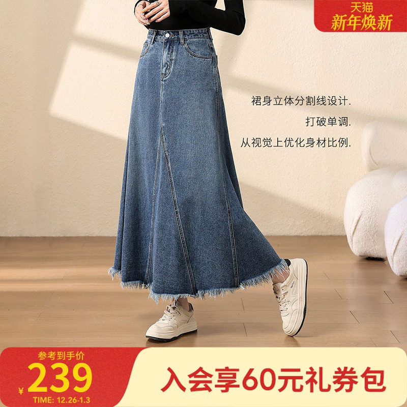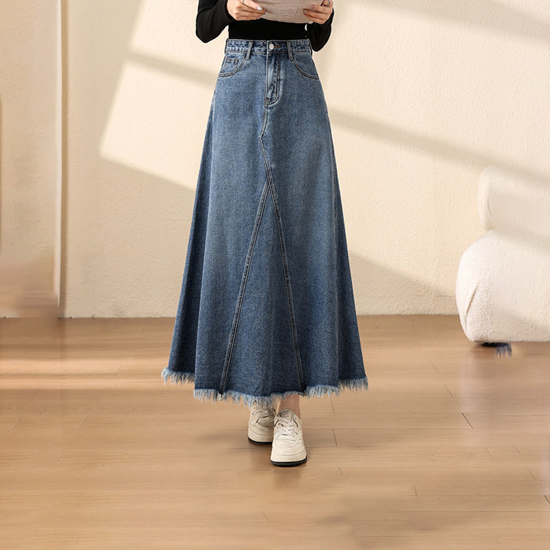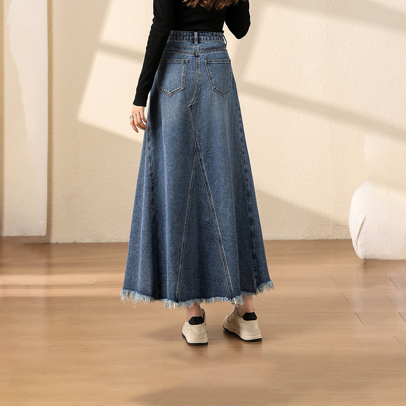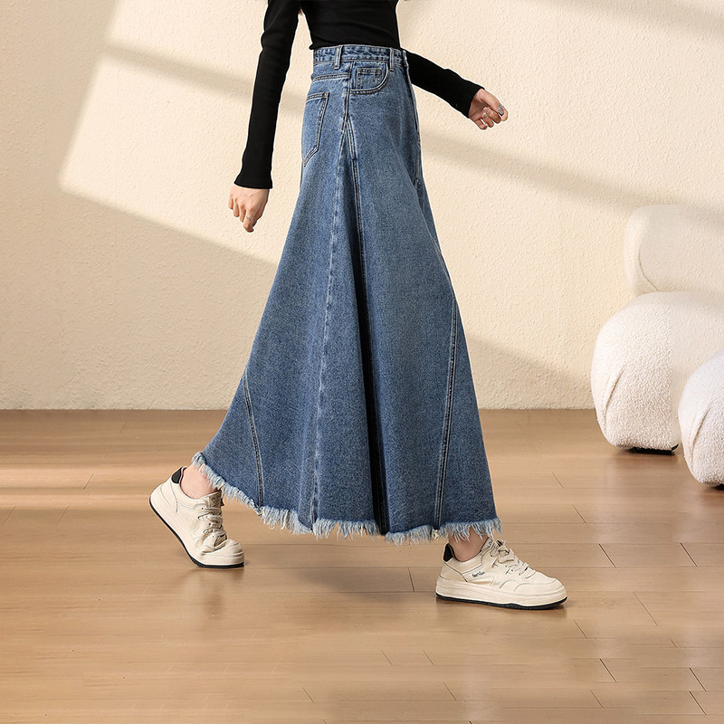 热风女士时尚复古立体分割设计感质感百搭A字毛边牛仔长款半裙