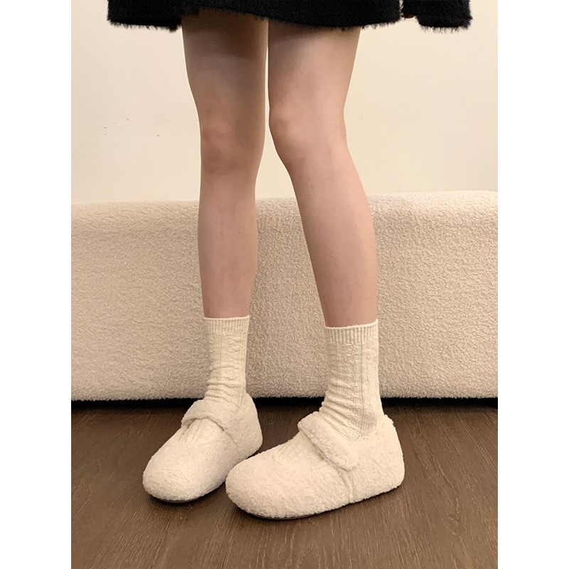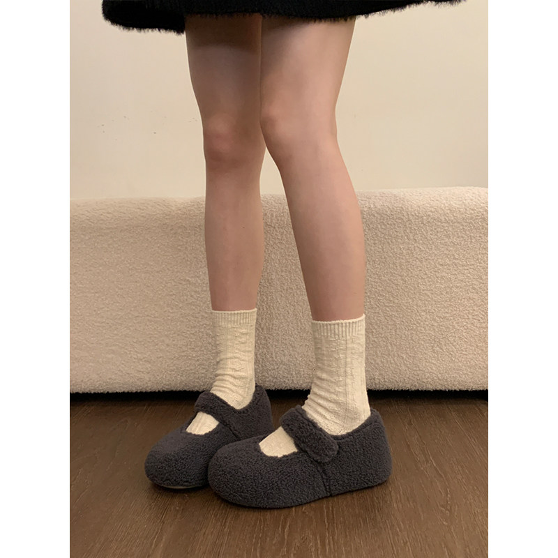 羊皮版复古玛丽珍鞋女方头秋冬季加绒保暖毛毛棉鞋平底晚晚单鞋女