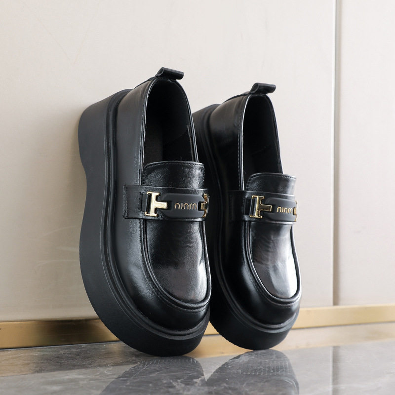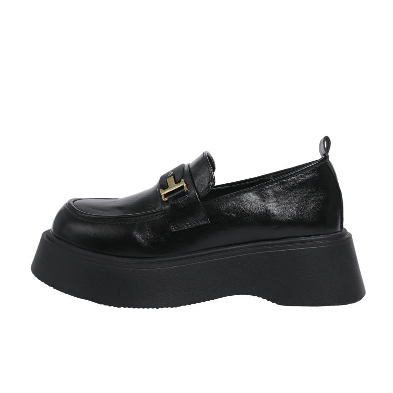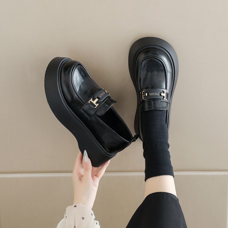 牛皮版~增高乐福鞋女英伦风凯旋门厚底黑色小皮鞋一脚蹬粗跟单鞋