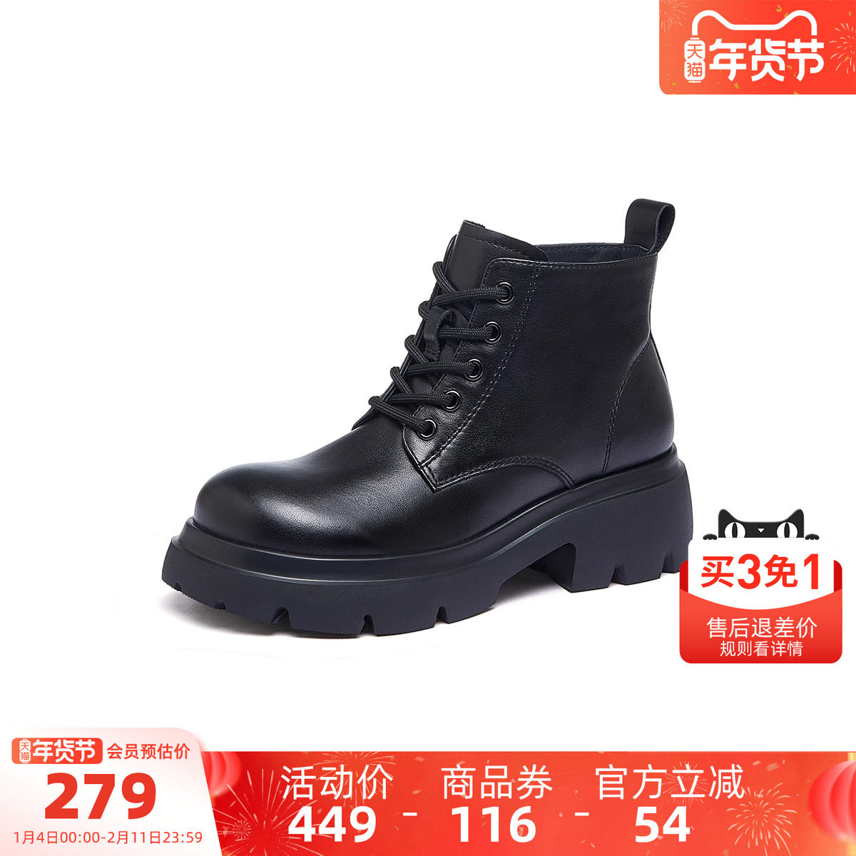 天美意复古英伦风厚底加绒马丁靴女鞋子冬新款休闲短靴皮靴时装靴