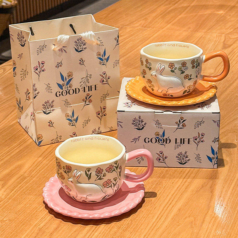 ins可爱花丛兔咖啡杯碟礼盒套装设计感陶瓷马克杯送女生生日礼物