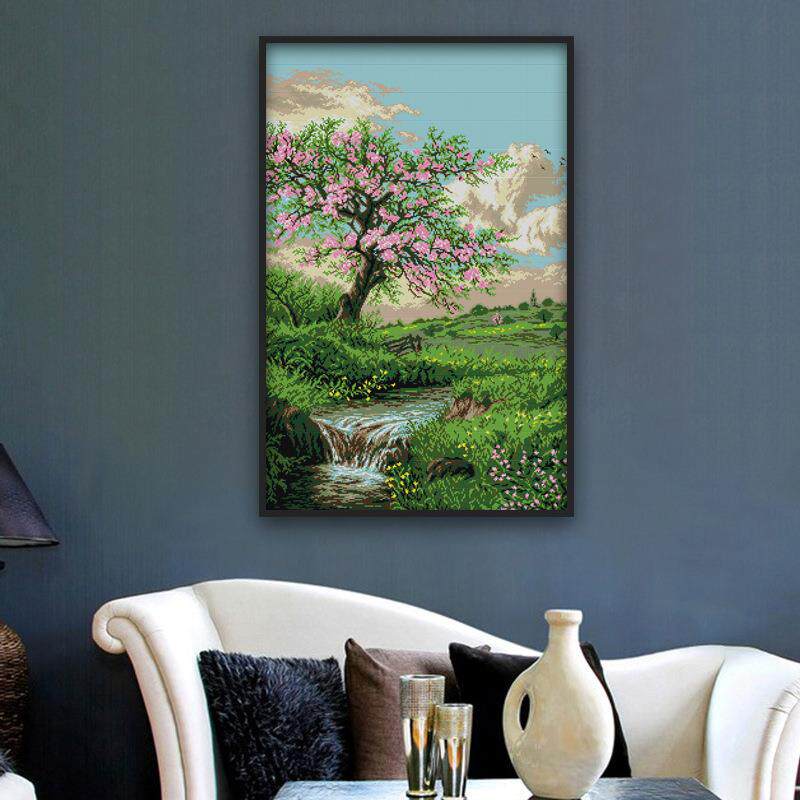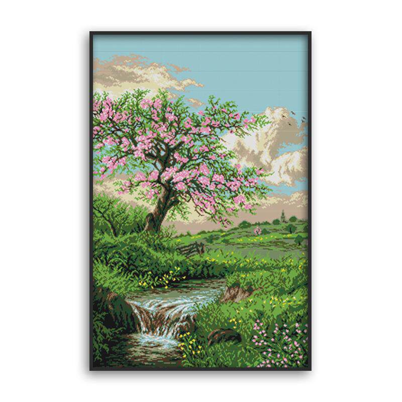 欢乐99小幅风景坚款花草卧室十字绣春天桃花开山水画十字绣图