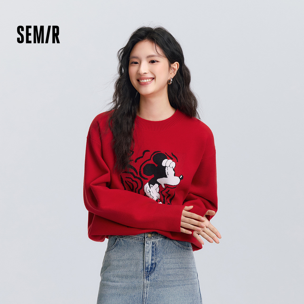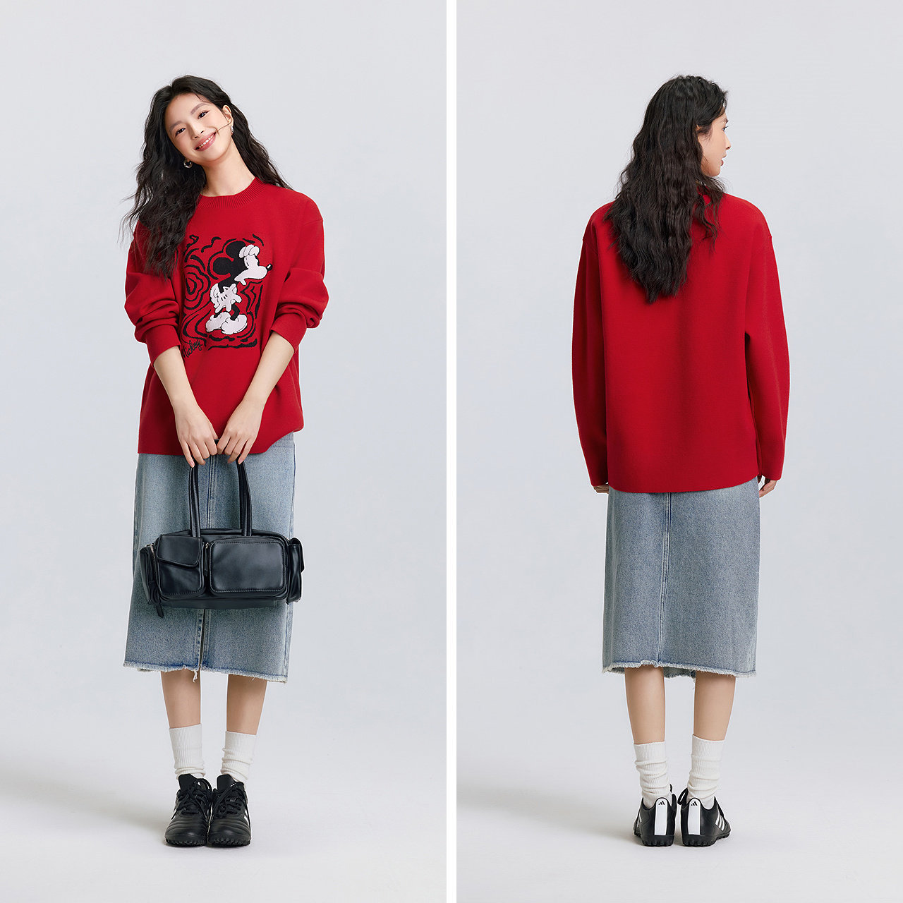 森马迪士尼合作系列毛衣女春季中长款红色oversize提花设计感毛衫