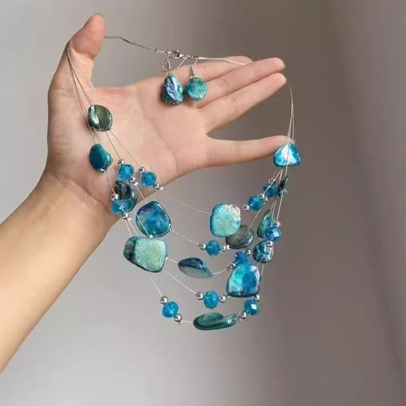 「人鱼秘境」独特多层蓝色不规则串珠项链欧美夸张小众设计锁骨链
