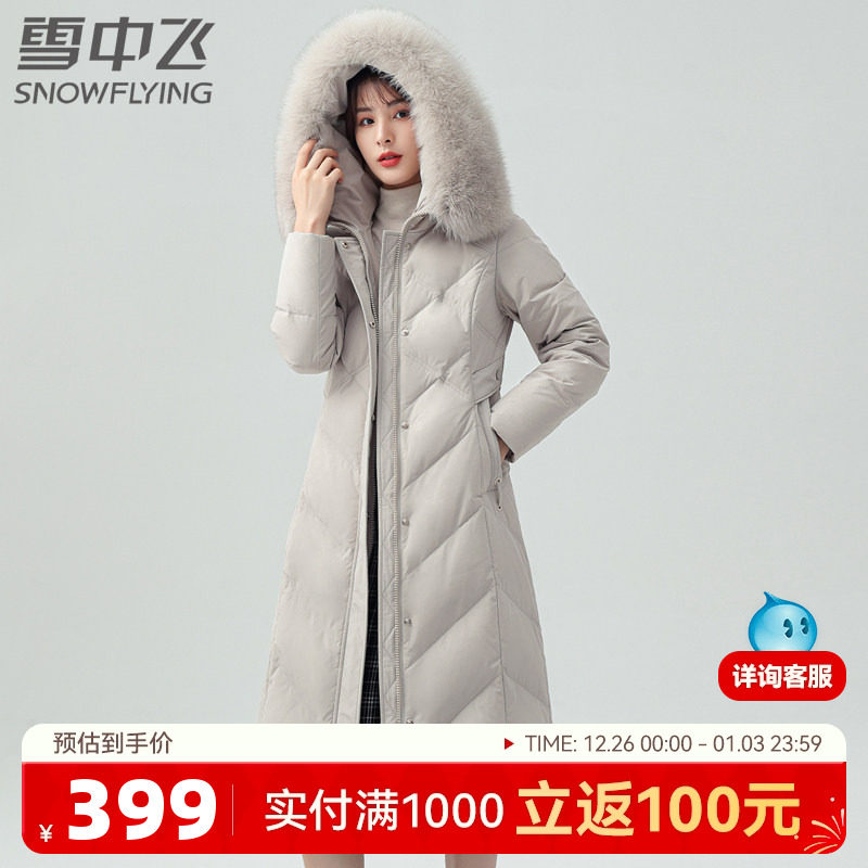 雪中飞秋冬女士狐狸毛领温暖连帽收腰版型长款妈妈中老年羽绒服