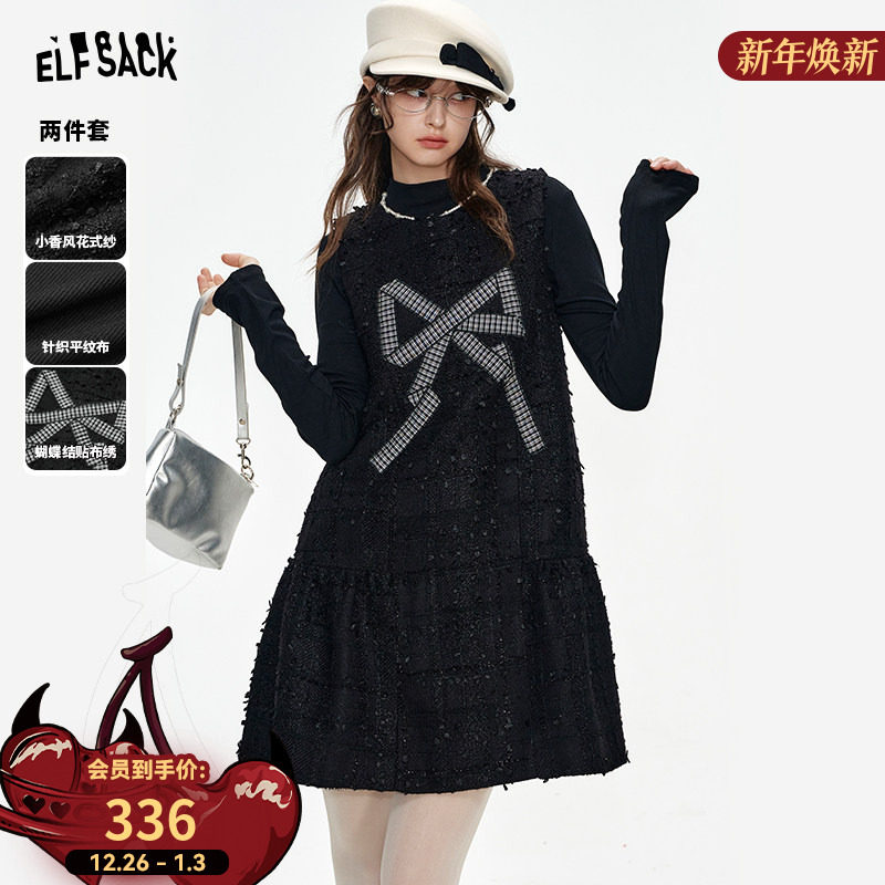 妖精的口袋小香风黑色细闪连衣裙套装女2025冬新款内搭显瘦小黑裙