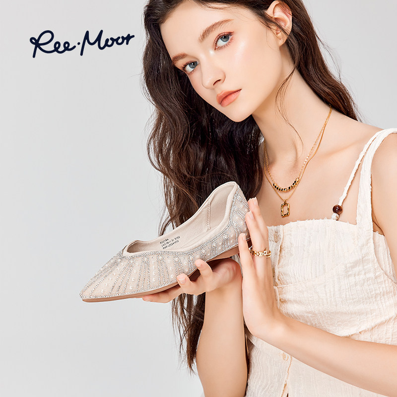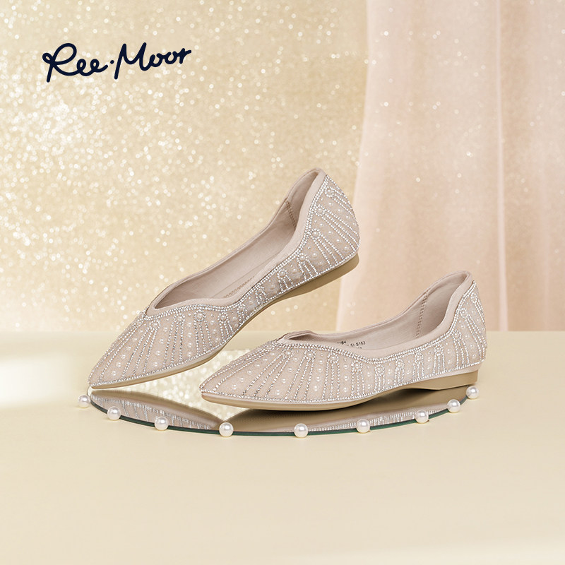 REEMOOR水钻尖头单鞋女浅口珍珠百搭舒适仙女风平底鞋蛋卷鞋婚鞋