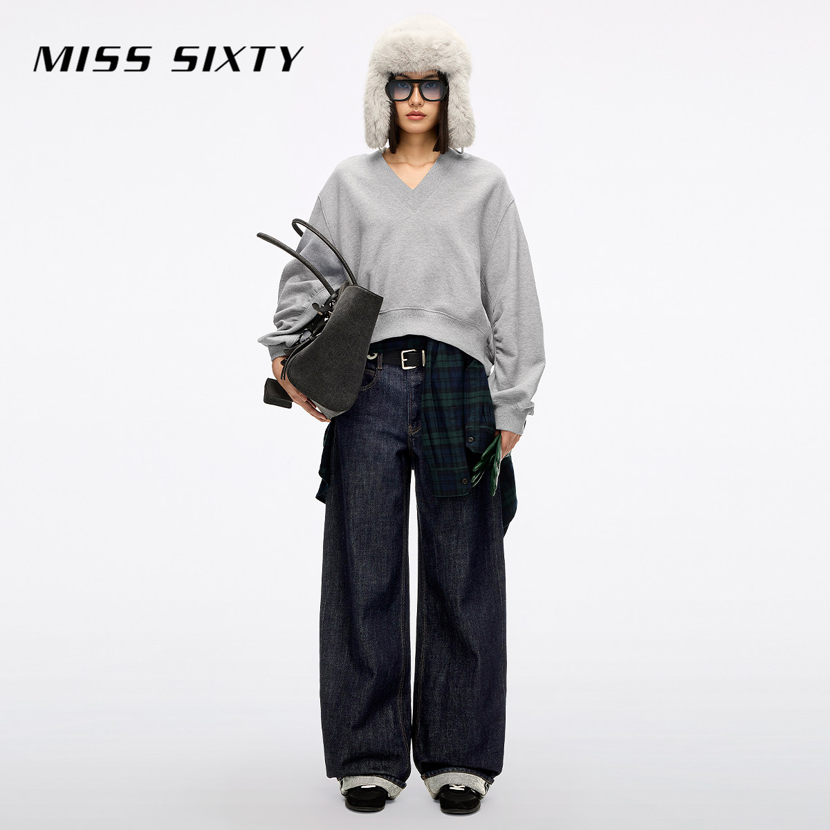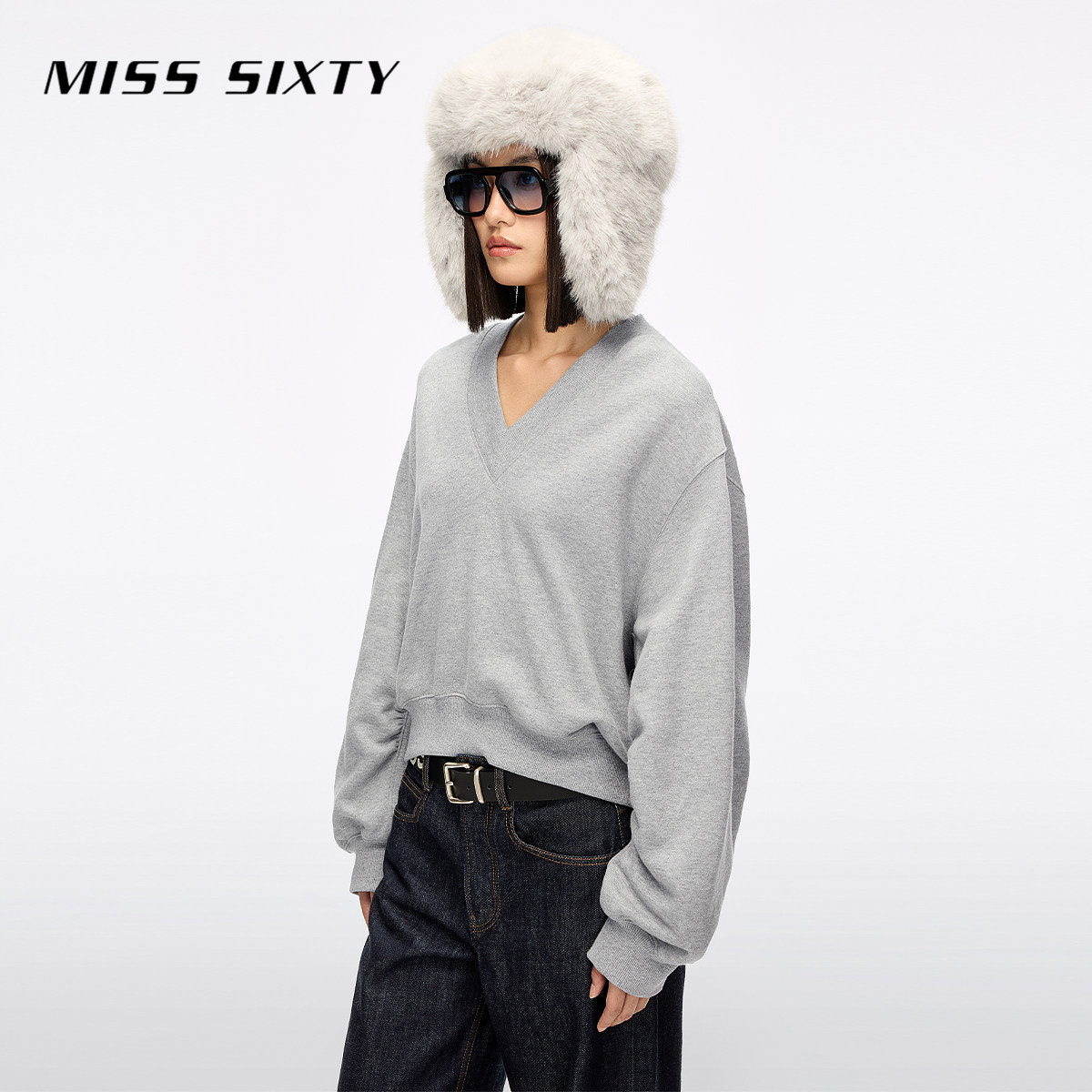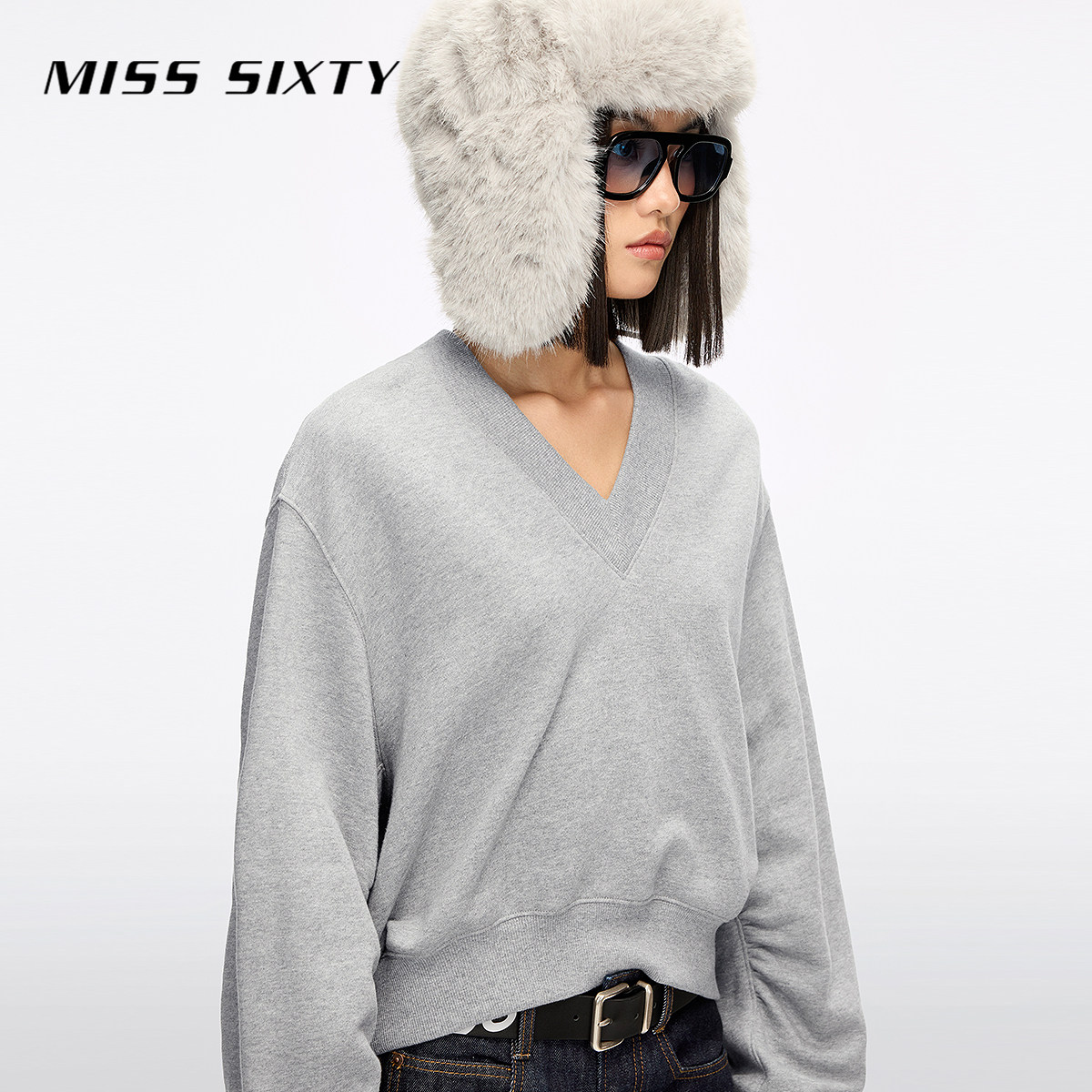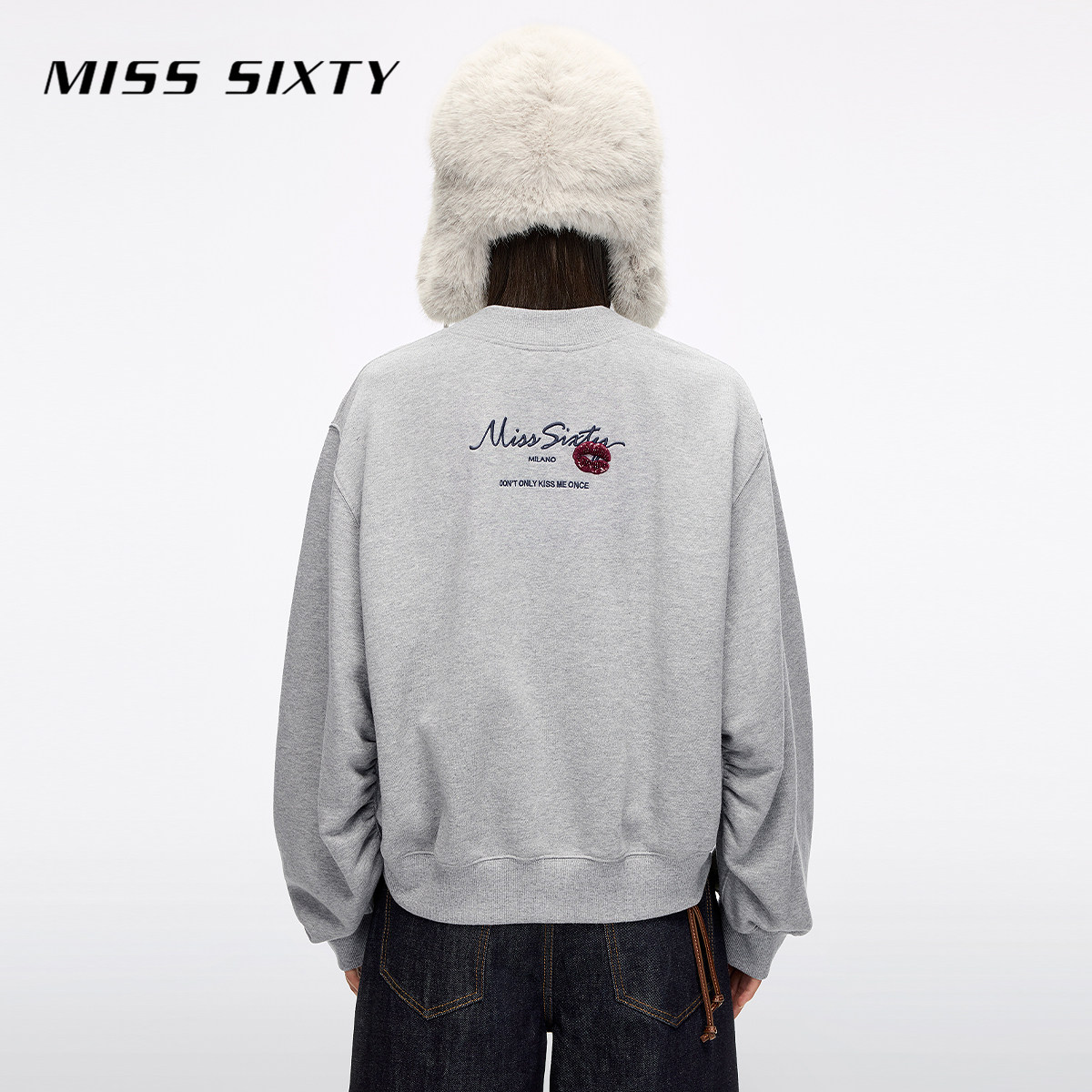 Miss Sixty2025冬季新款棉质卫衣女V领刺绣唇印上衣复古运动风
