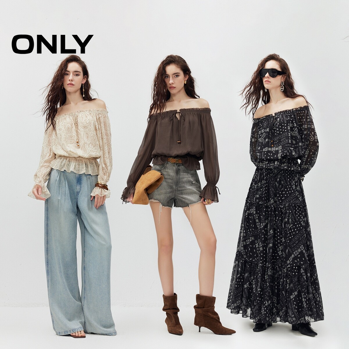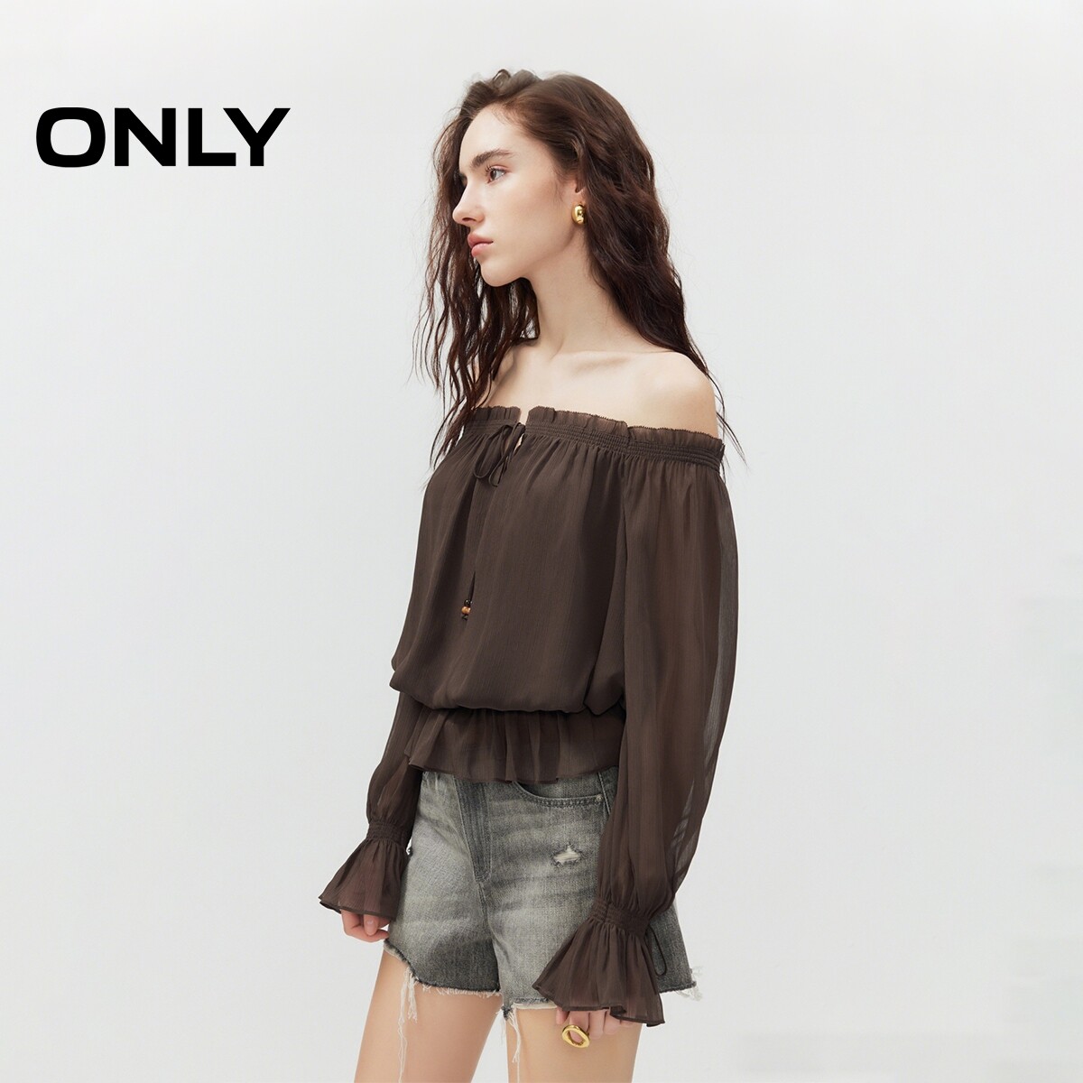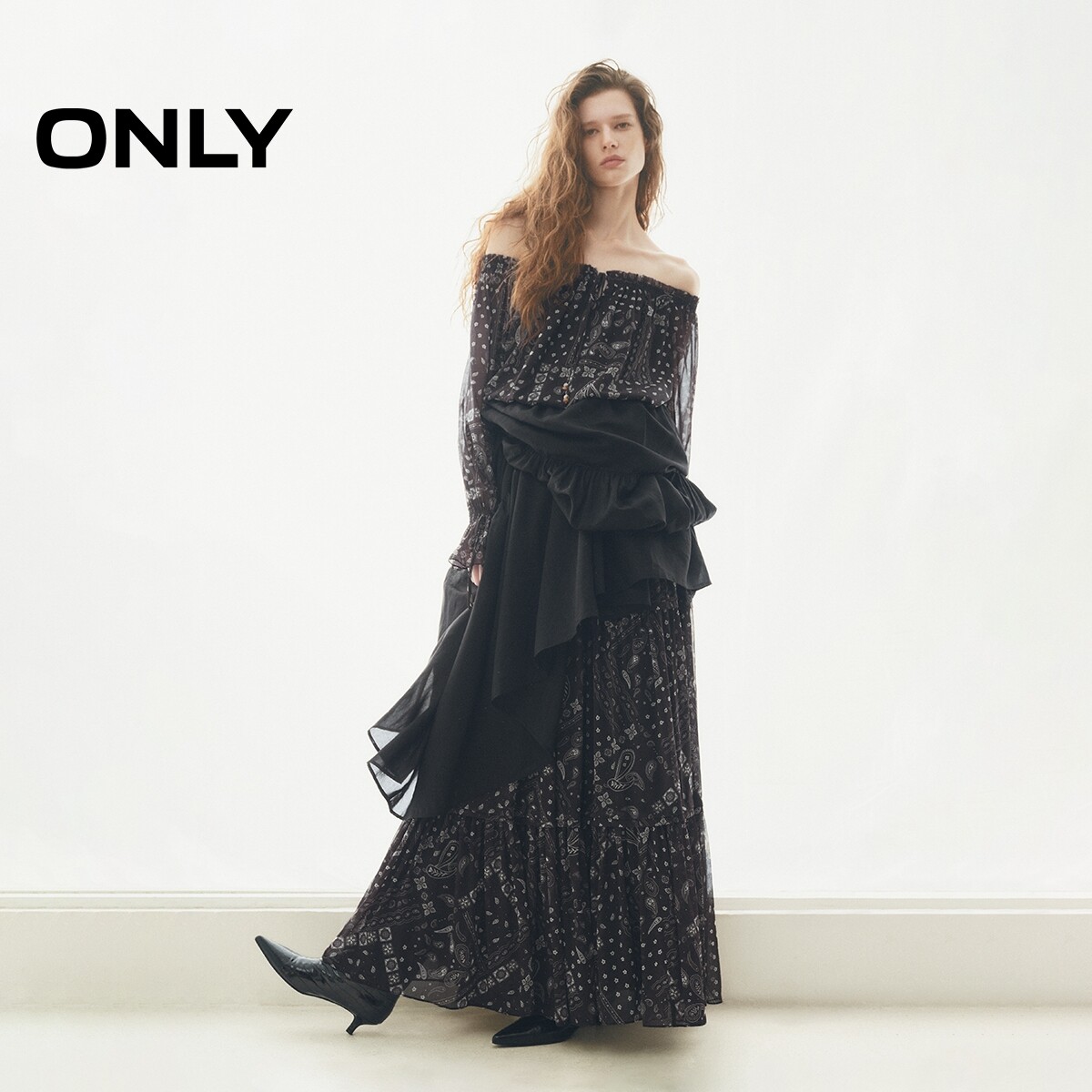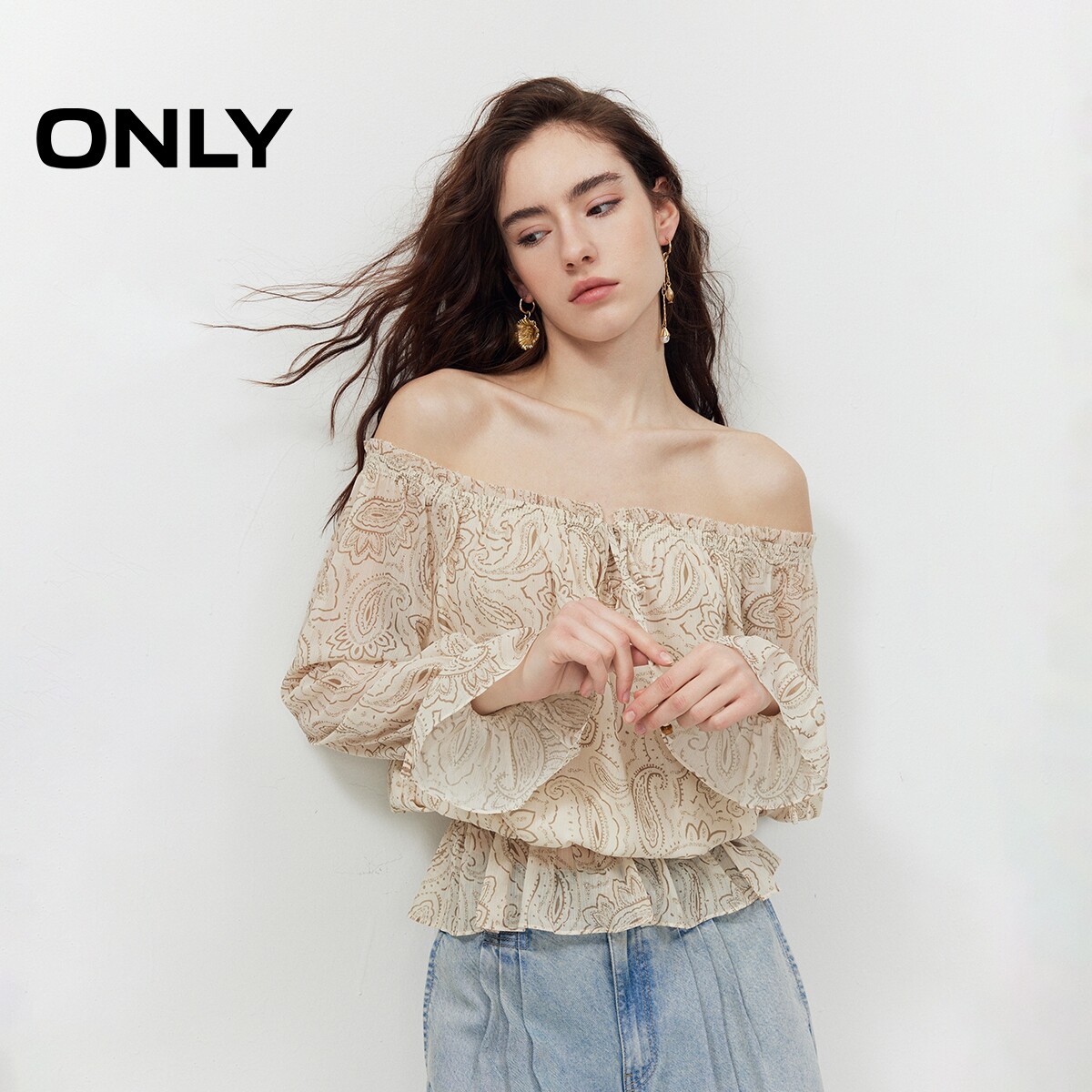 ONLY2026夏季新款优雅一字肩荷叶边收腰长袖腰果印花蕾丝衫上衣女