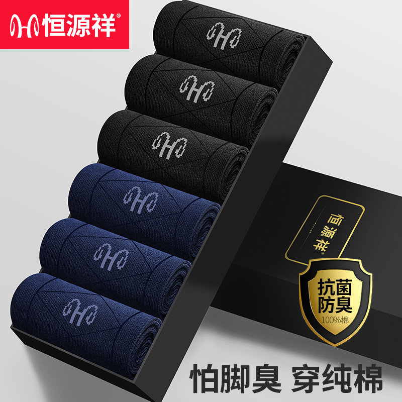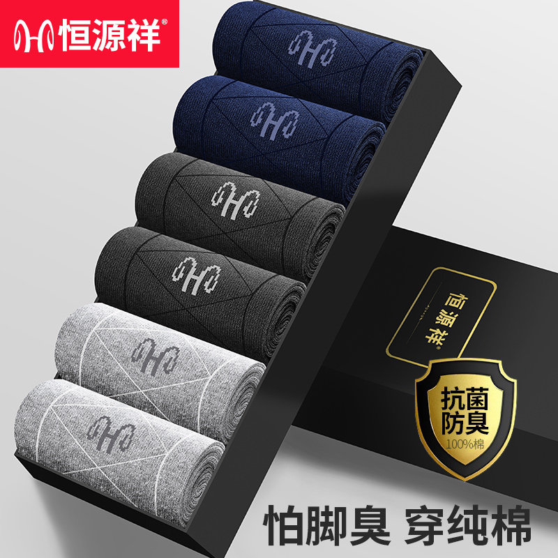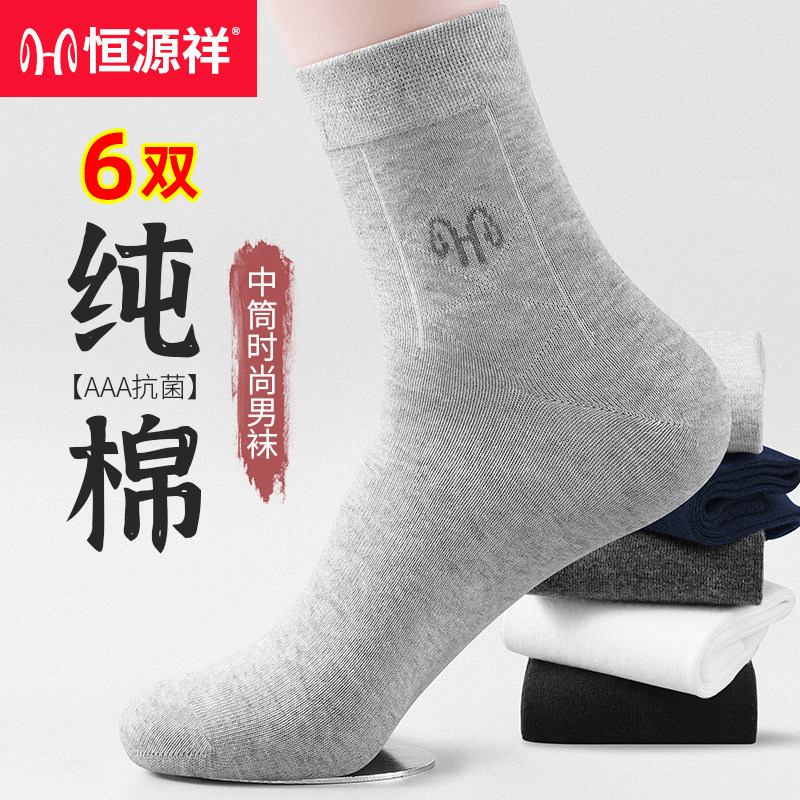 恒源祥袜子男100%纯棉防臭秋冬季男士中筒袜全棉吸汗透气商务男袜