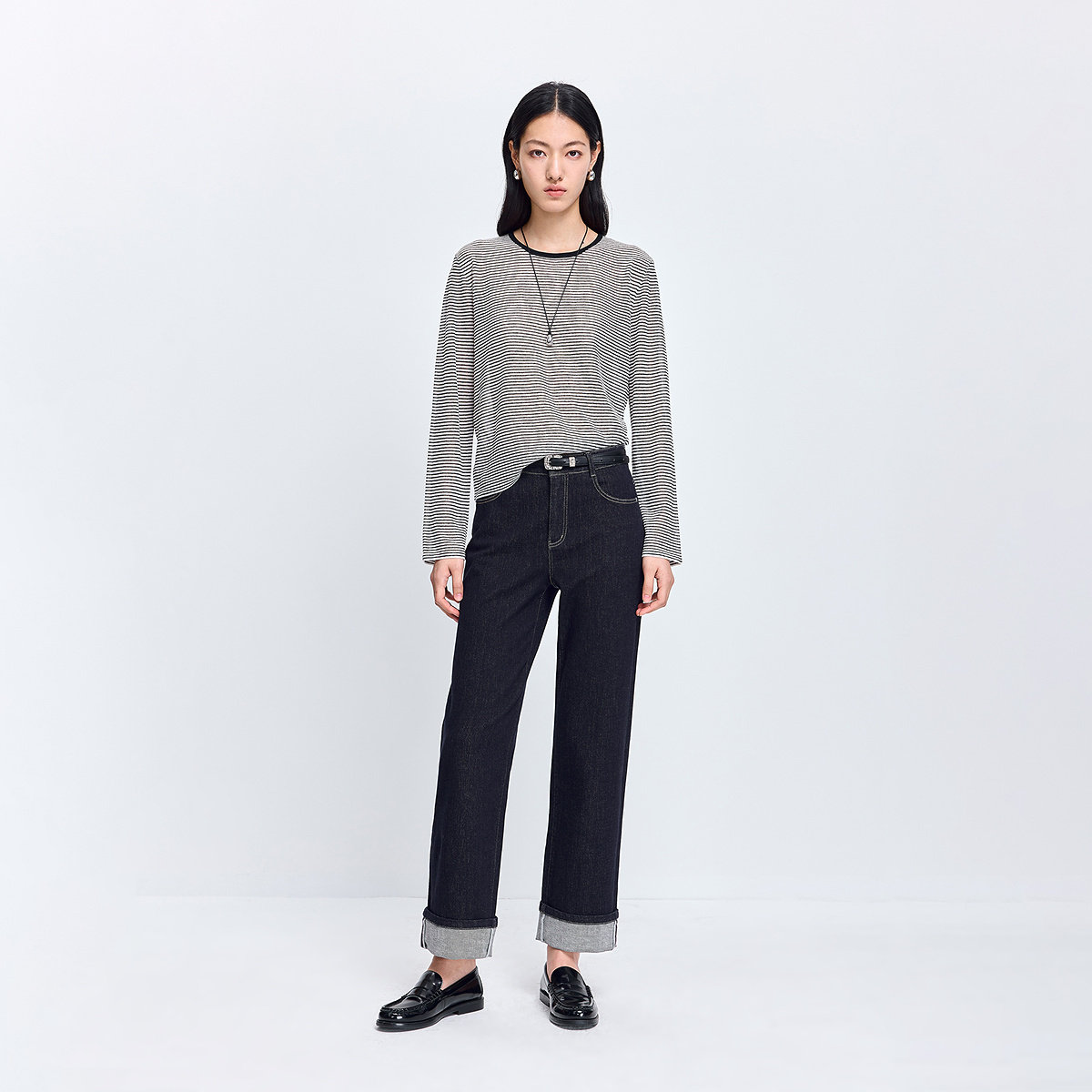 三福长袖上衣2025新款秋季圆领修身针织衫简约纯色内搭打底衫女装