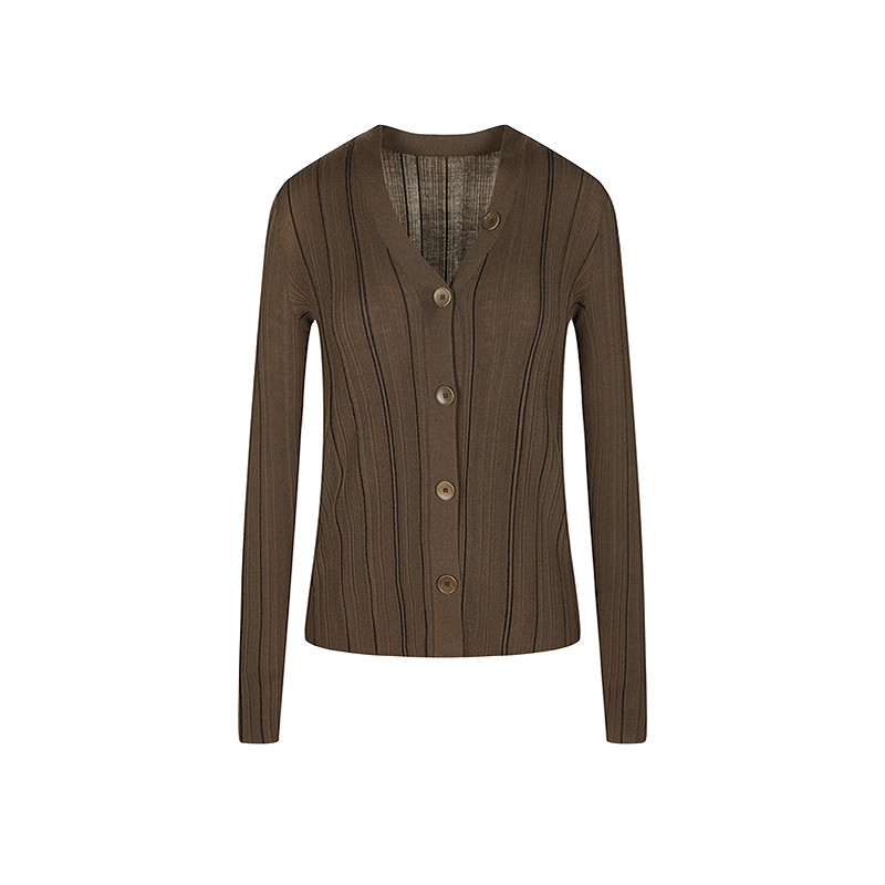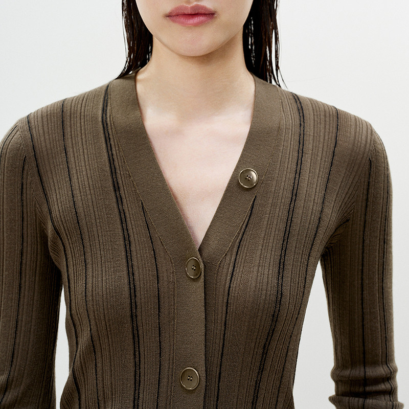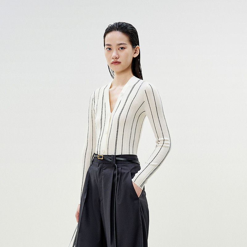 LESS春修身简约内搭毛衫优雅撞色坑条打底针织开衫女2P2313210