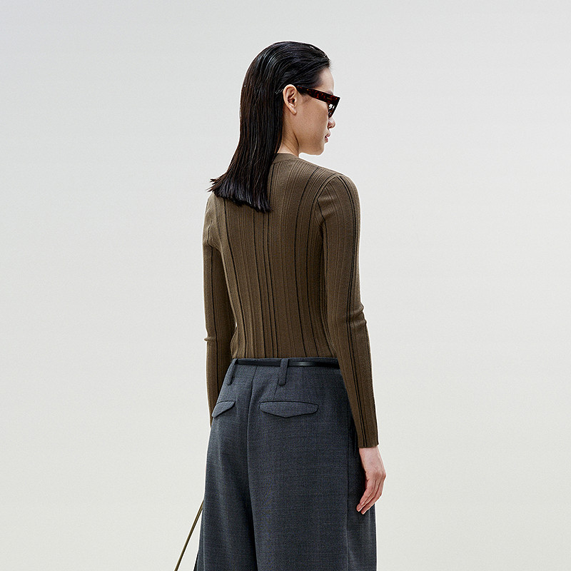 三福长袖上衣2025新款秋季圆领修身针织衫简约纯色内搭打底衫女装