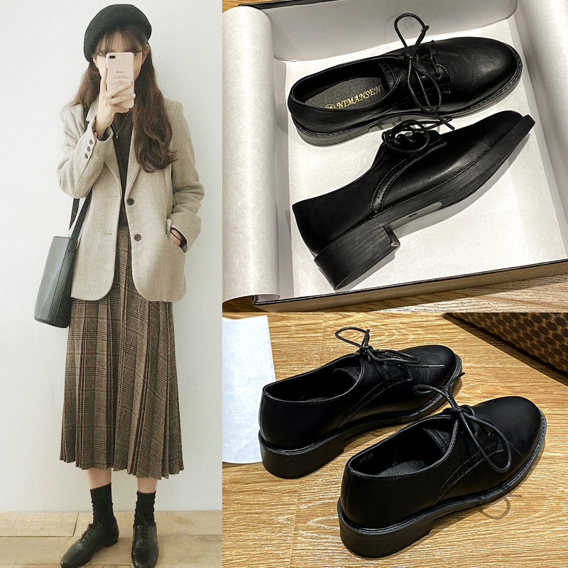 真皮英伦风小皮鞋女鞋2025春秋新款加绒黑豆豆鞋平底系带黑色单鞋