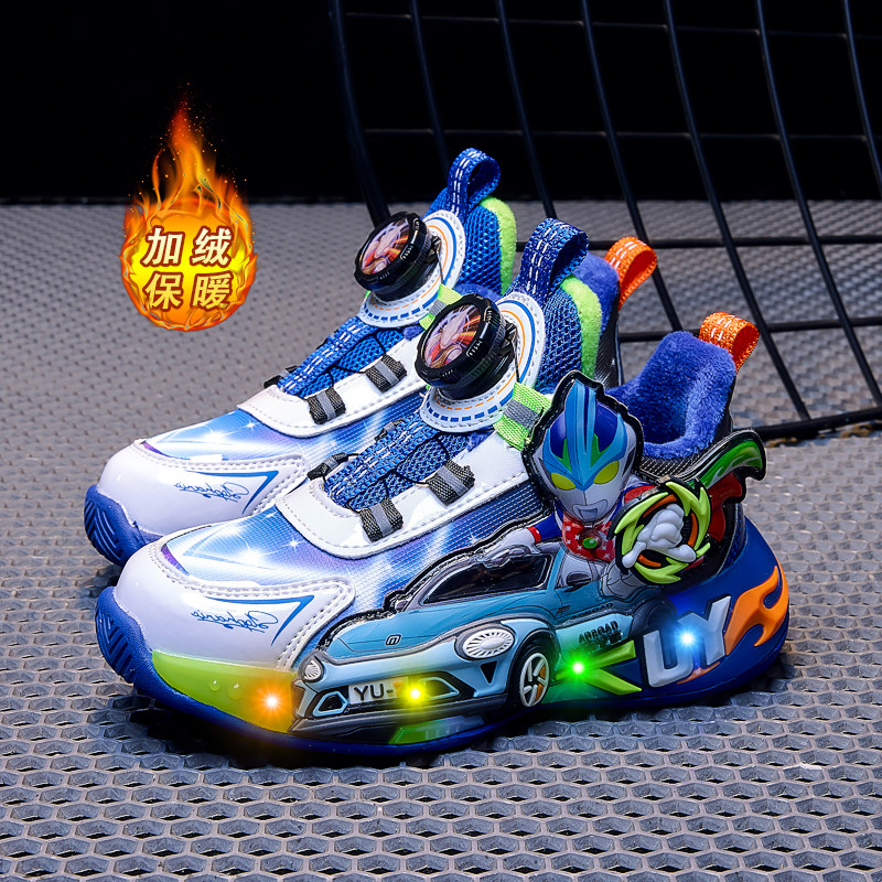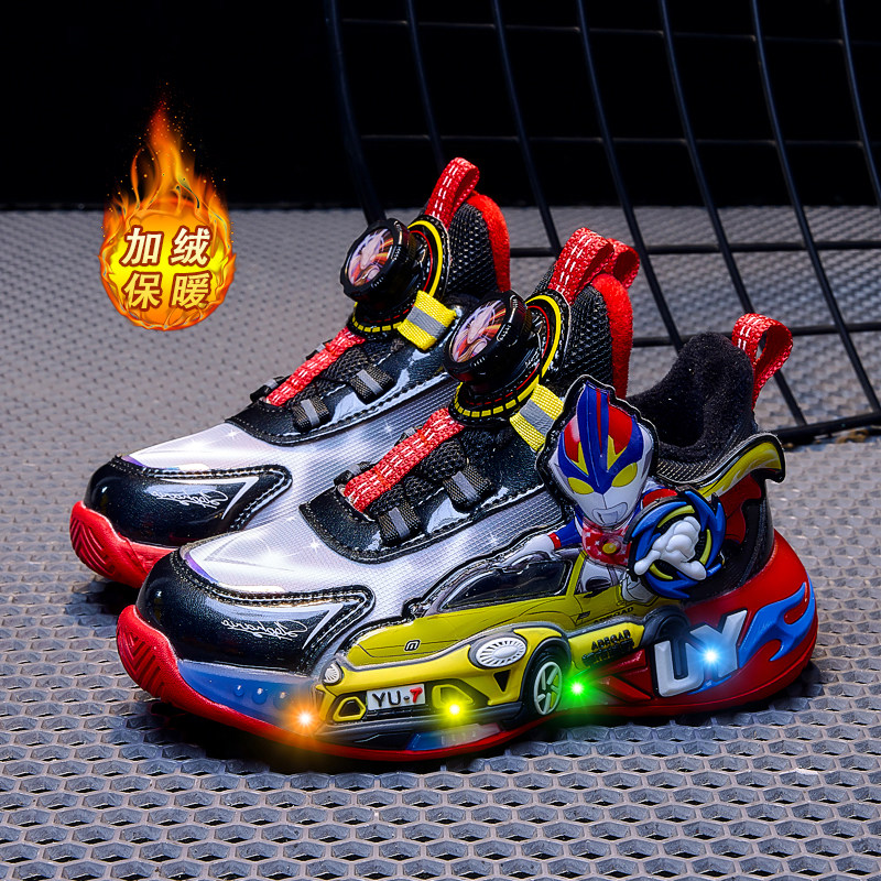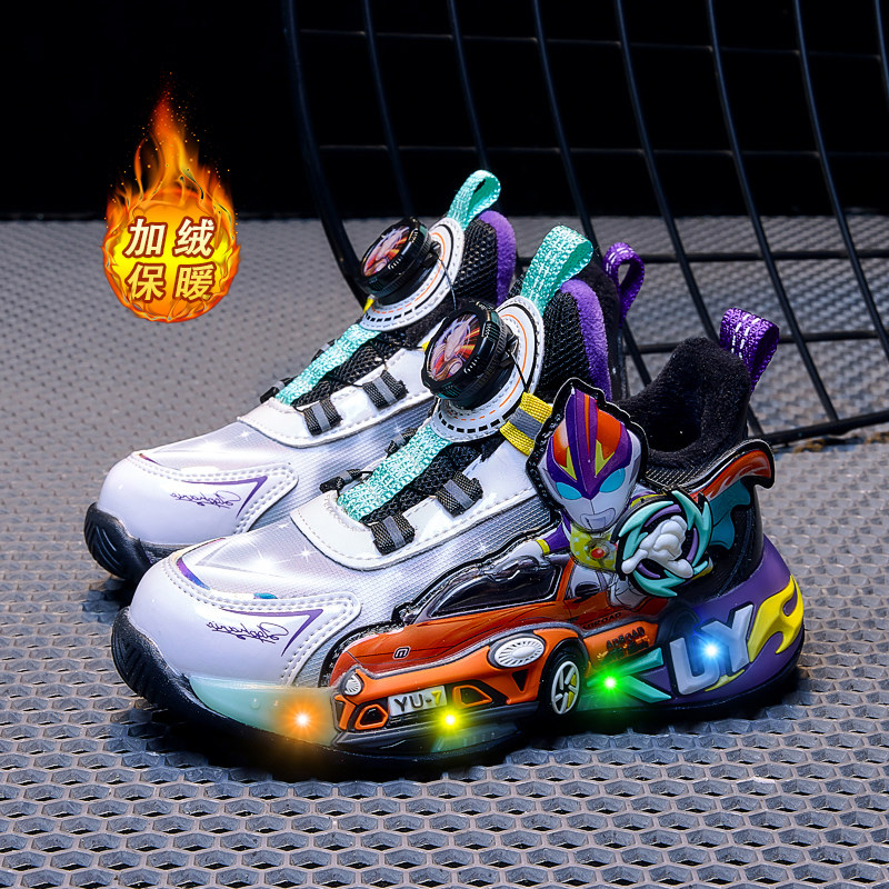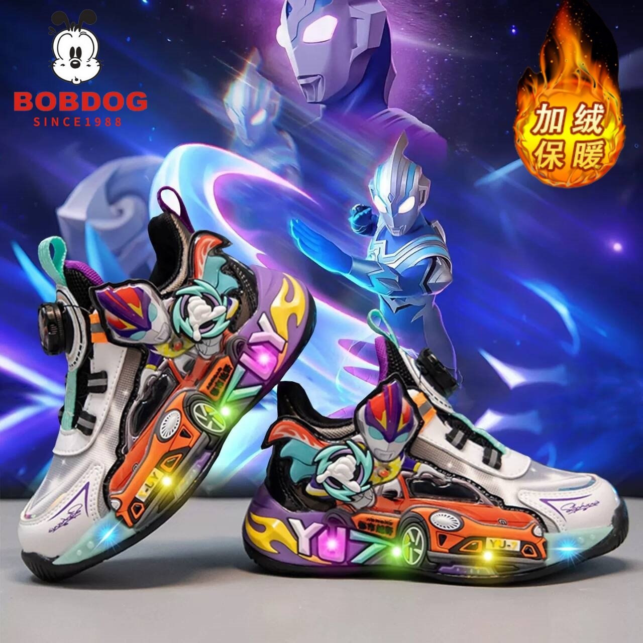 巴布豆真皮男童曼运动鞋新款加绒儿童保暖灯鞋男孩老爹鞋发光秋冬