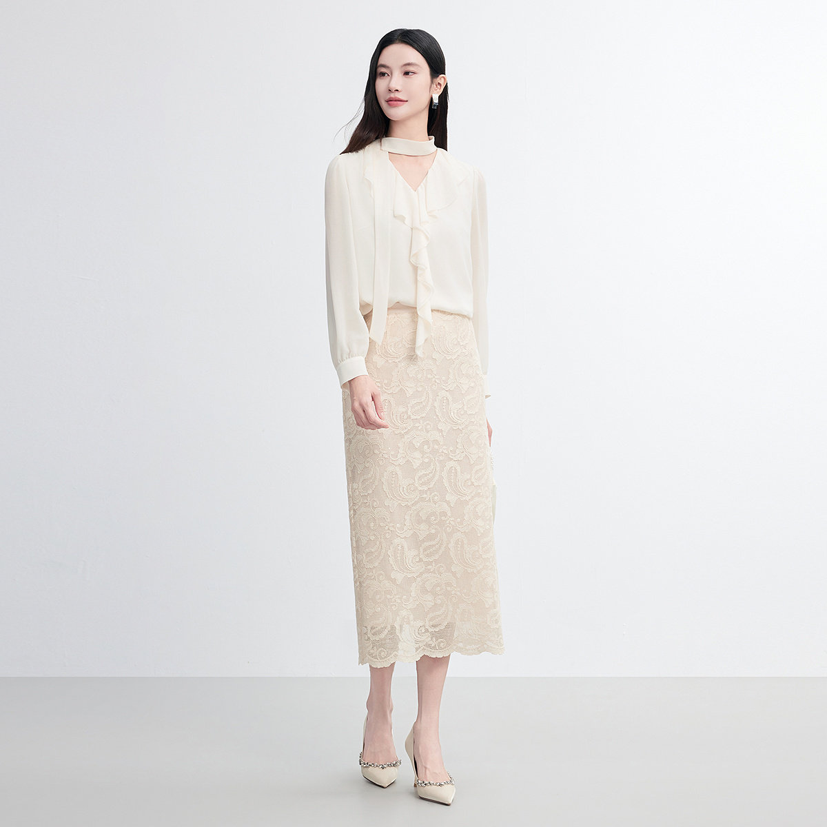 COCOBELLA多层蕾丝雪纺衫女秋赫本风木耳荷叶边长袖衬衫LC7028-2
