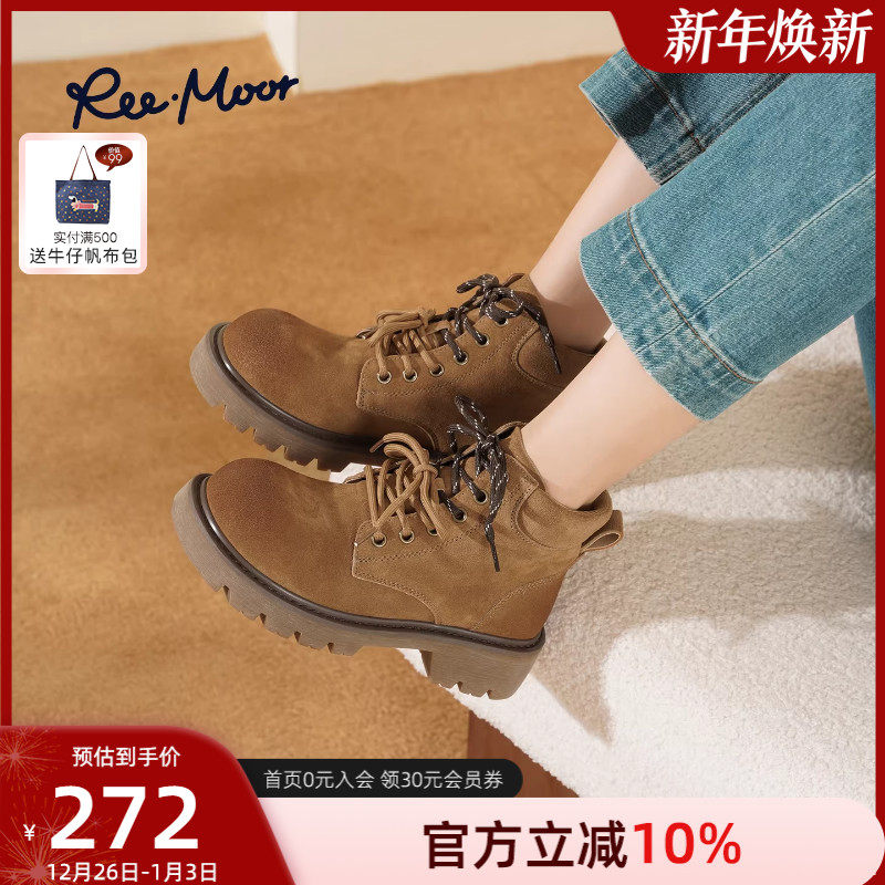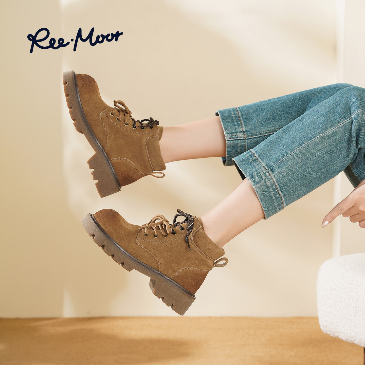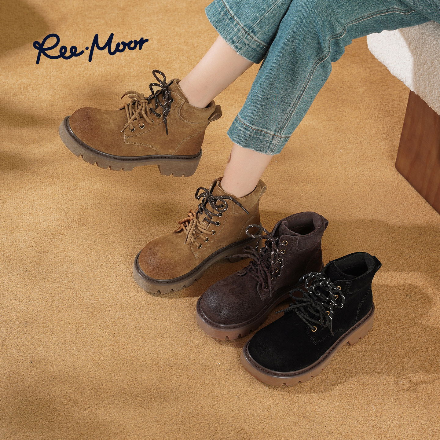 REEMOOR睿慕2025冬季新款复古英伦风圆头粗跟厚底增高马丁靴女