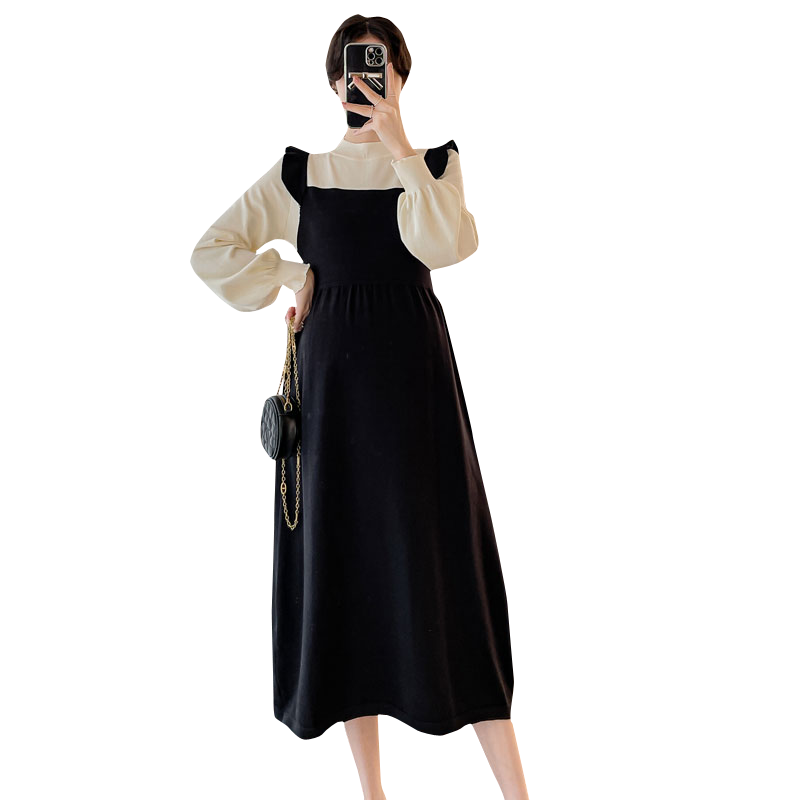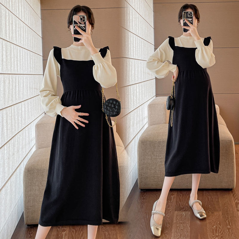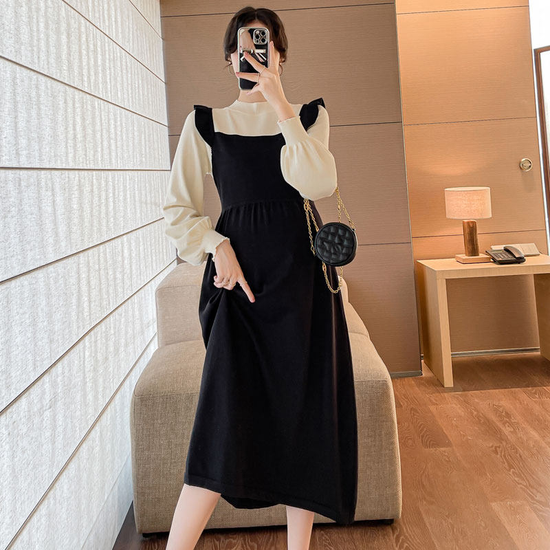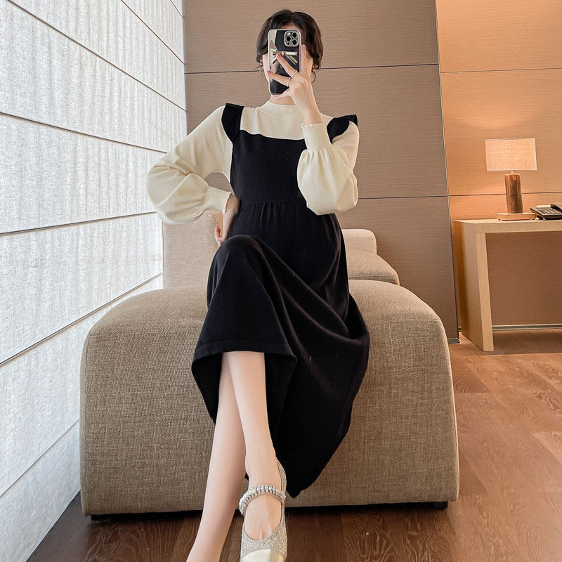 婧麒孕妇装秋季装假两件拼色长袖针织连衣裙宽松显瘦裙子打底裙女