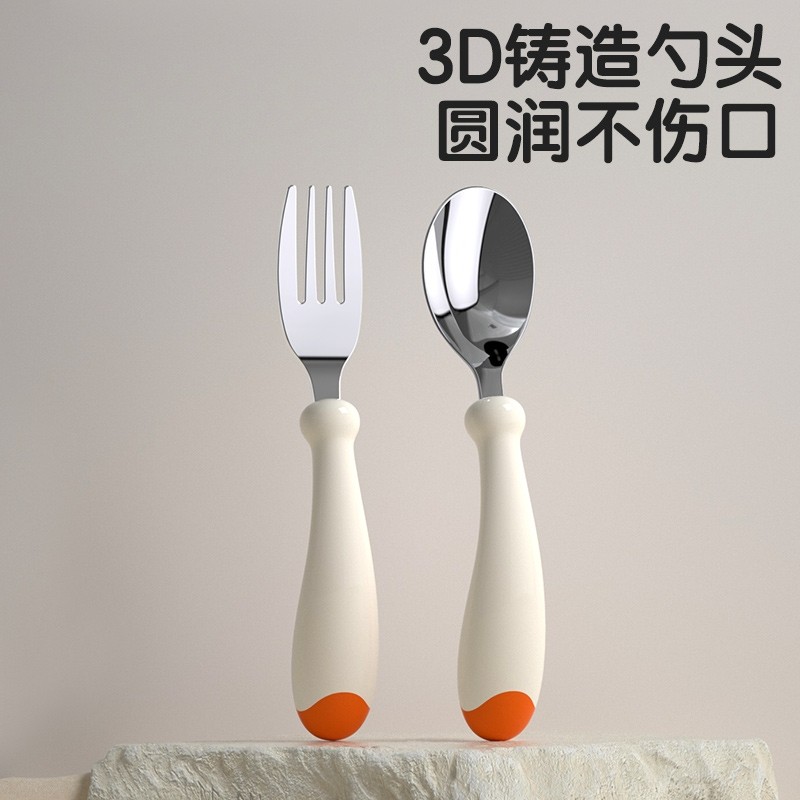 儿童勺子自主进食宝宝叉勺学吃训练吃饭专用餐具316L不锈钢元宝勺