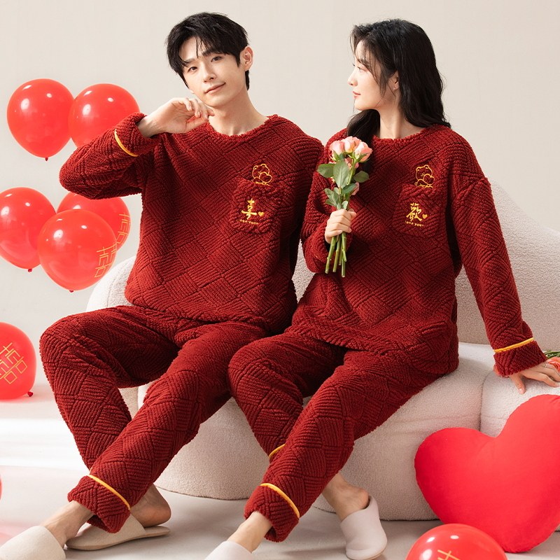 情侣睡衣冬季珊瑚绒大红色新婚结婚套装秋冬天加绒加厚男女家居服
