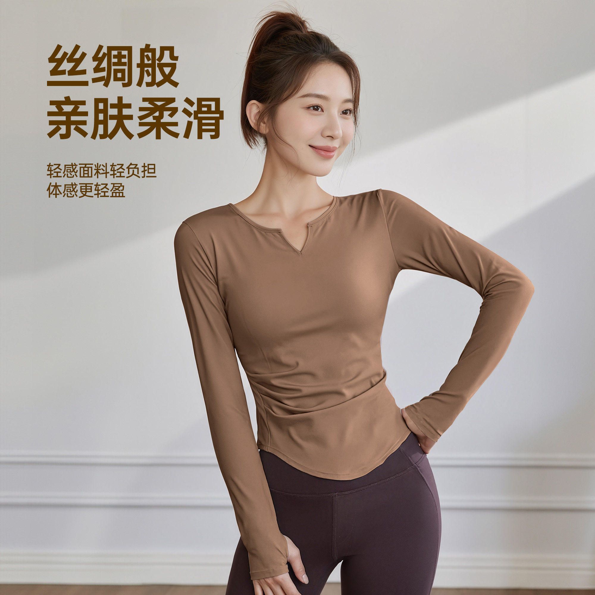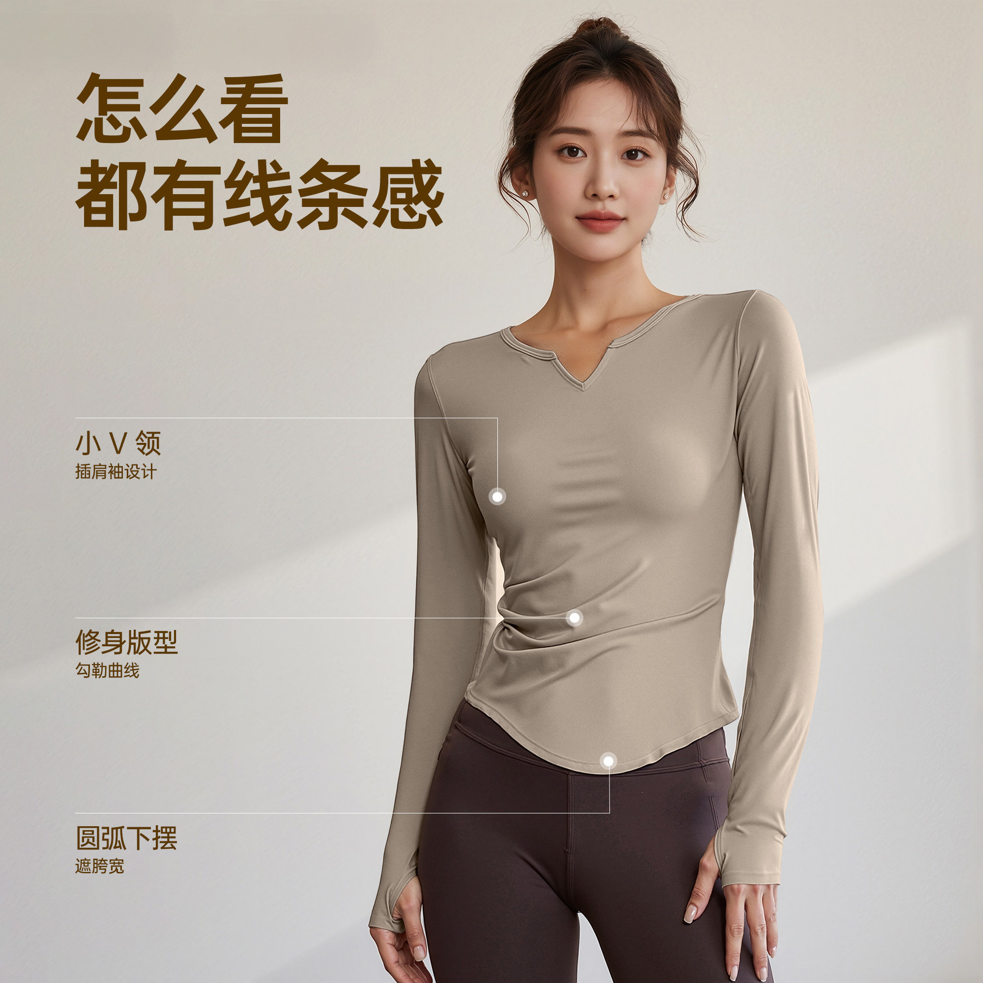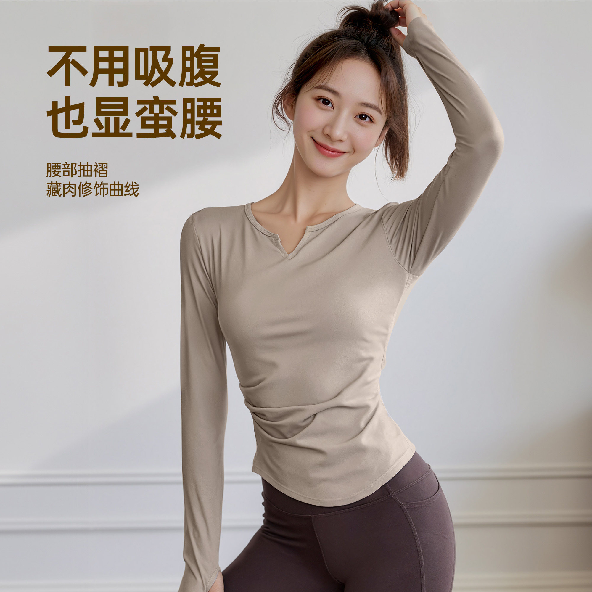 佑美瑜伽服运动健身衣女小蛮腰V领普拉提训练服长袖运动跑步上衣