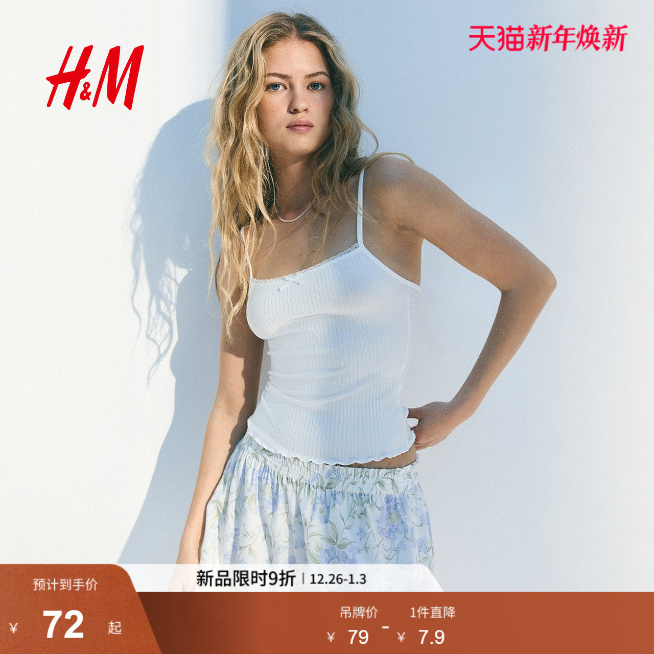 HM女装吊带2025年新款蝴蝶结修身蕾丝边酒红色吊带上衣1296060