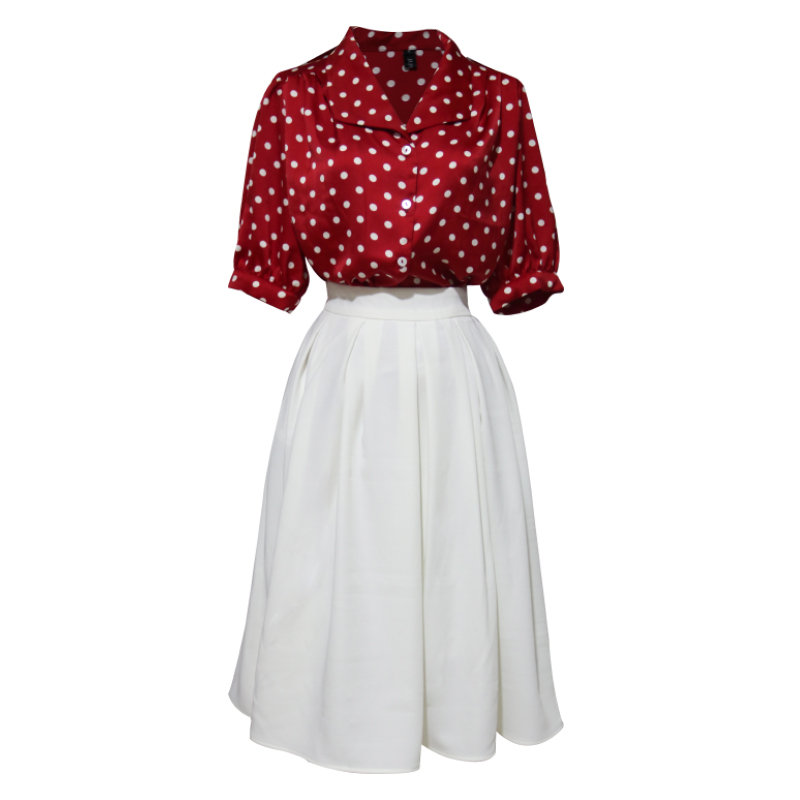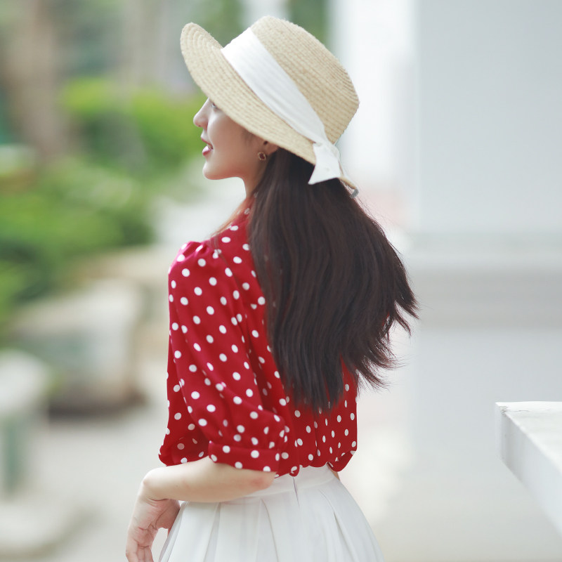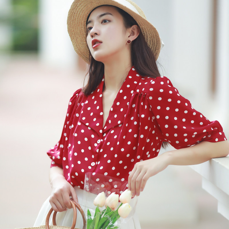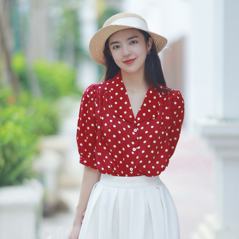 复古港风红色波点短袖上衣雪纺衬衫宽松大码配白色半身裙套装女夏