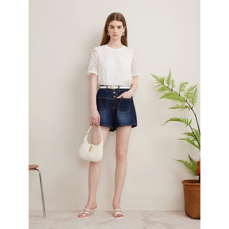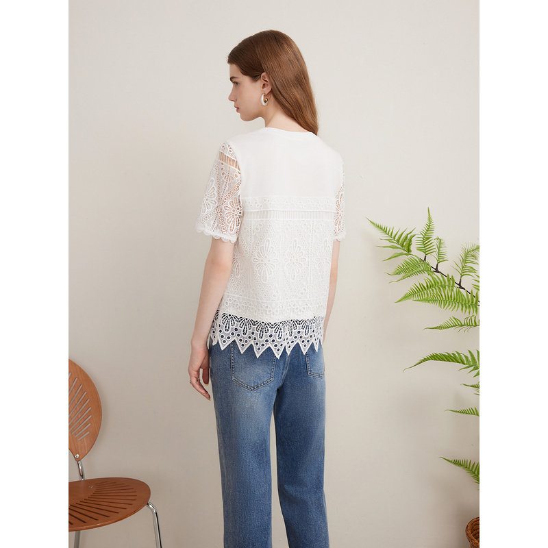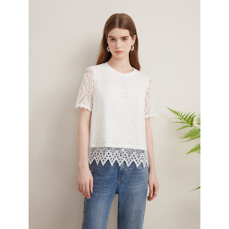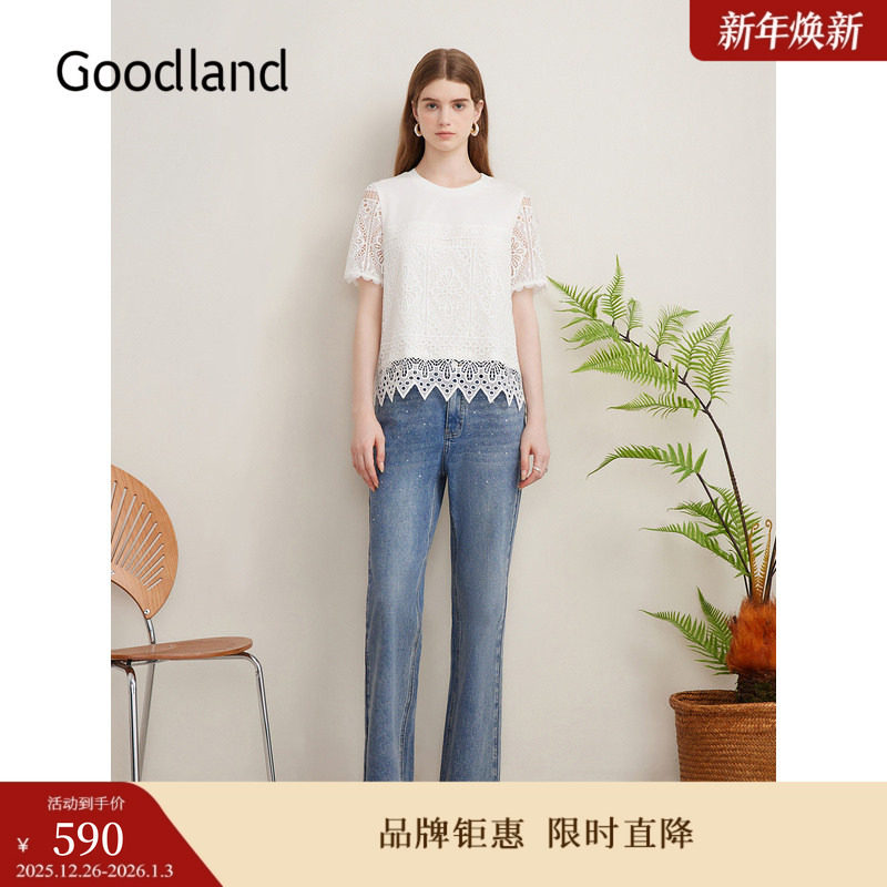 Goodland美地夏季艺术镂空肌理T恤蕾丝短袖上衣