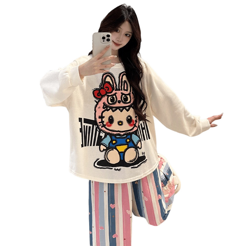 带胸垫睡衣女春夏款2026新款棉绸长袖可爱卡通女士大码时尚家居服