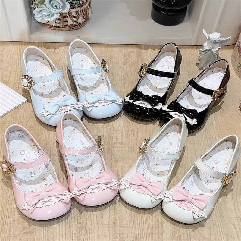 真皮~骄屿法式仙女风高跟鞋女婚鞋玛丽珍鞋珍珠系蝴蝶结粗跟单鞋