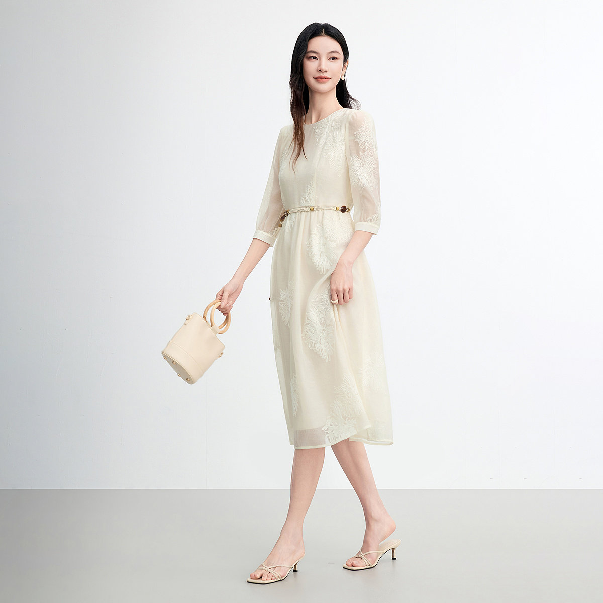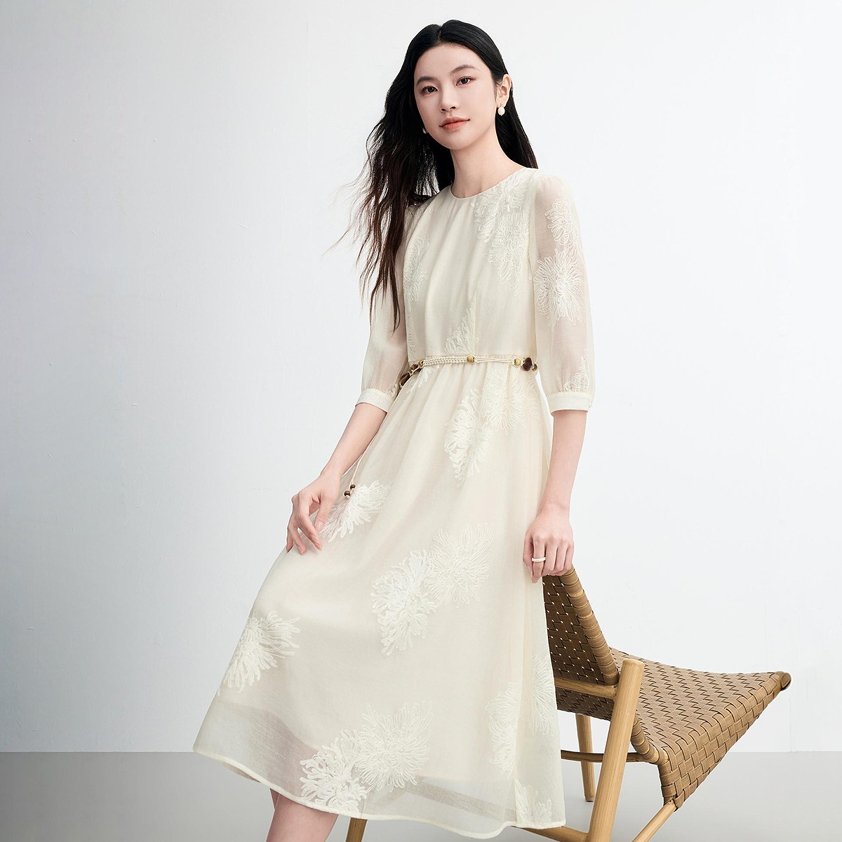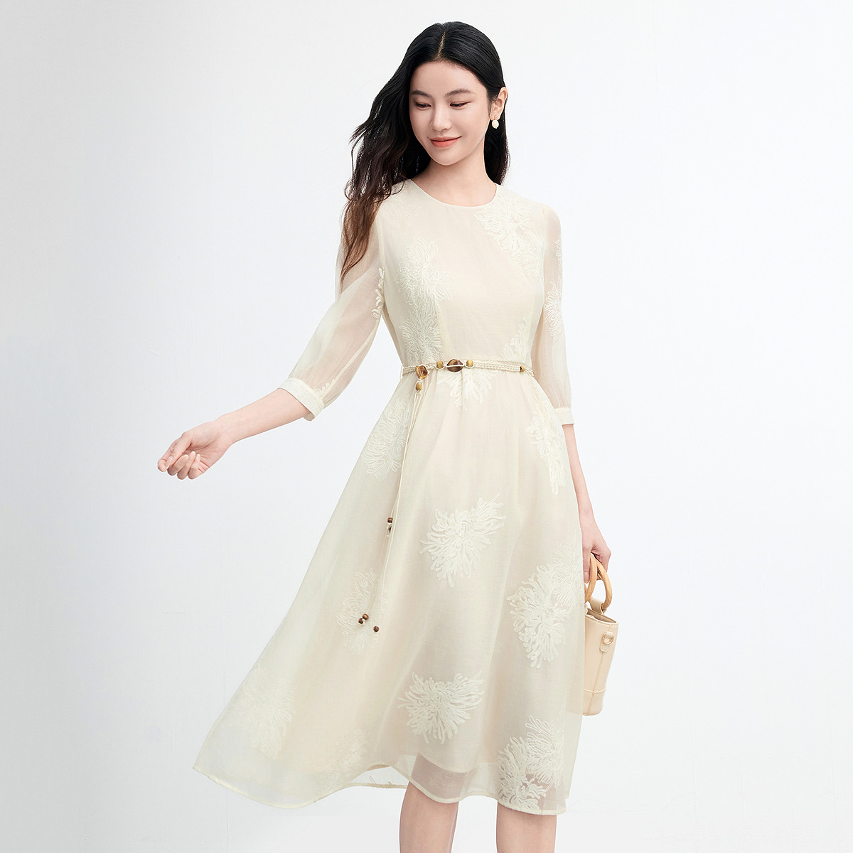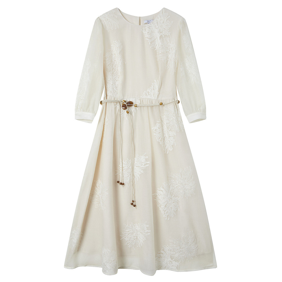 FINITY菲妮迪连衣裙2026年春季新款简约圆领米黄色优雅系带长裙女