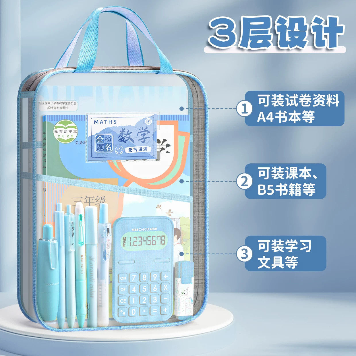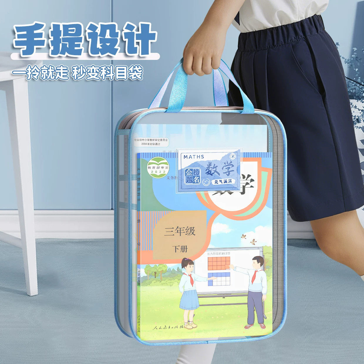 科目分类文件袋透明拉链式a4收纳拎书课外班作业男女孩书包小学初中生l型考试试卷学科补习网纱手提袋大容量