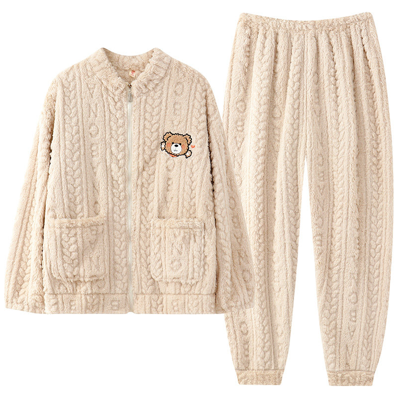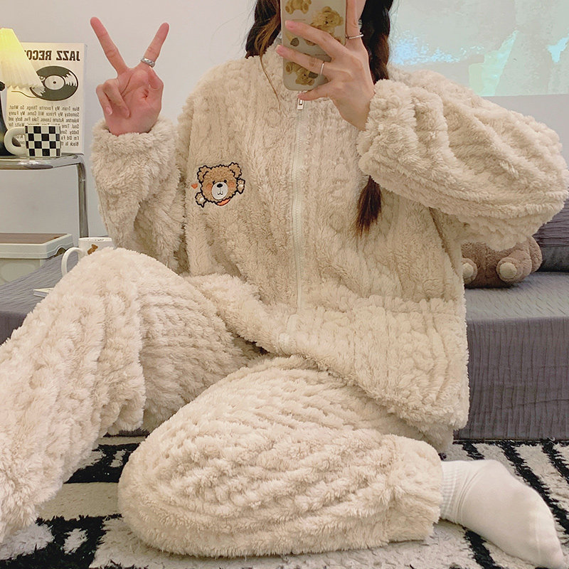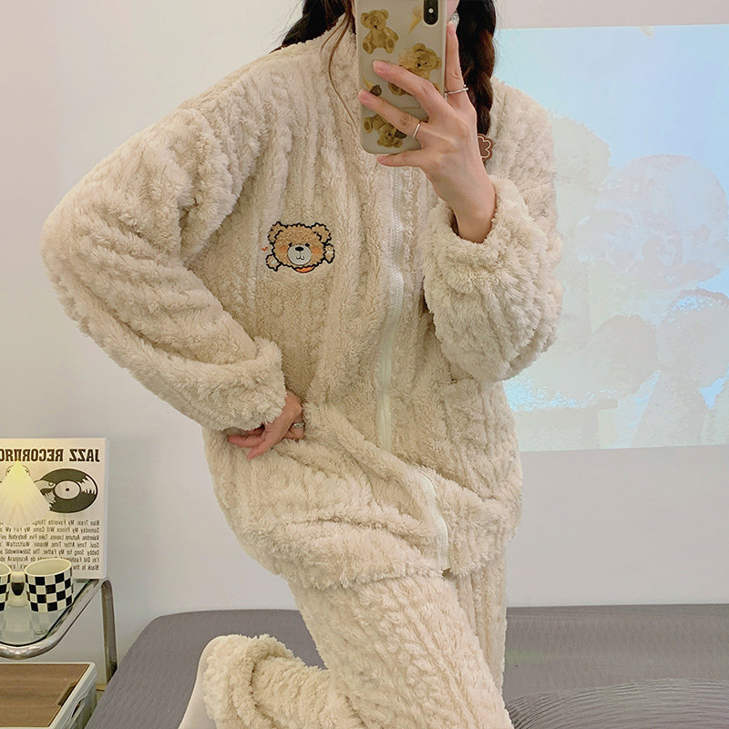 睡衣女冬季开衫珊瑚绒加绒款法兰绒可外穿家居服套装立领外出刺绣