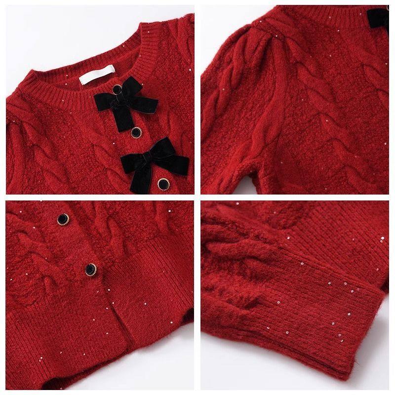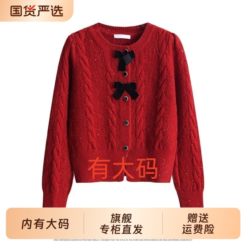 法式小香风蝴蝶结红色针织衫2025秋冬新款大码内搭麻花毛衣开衫