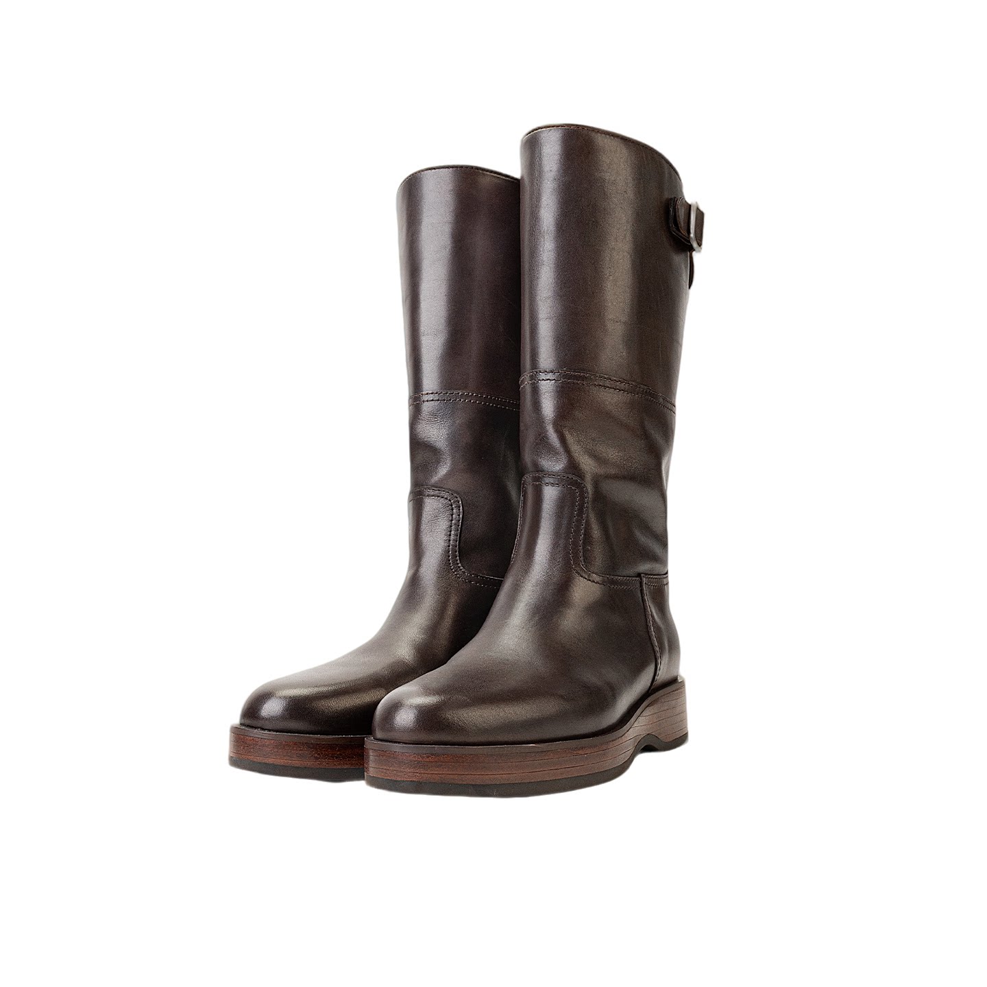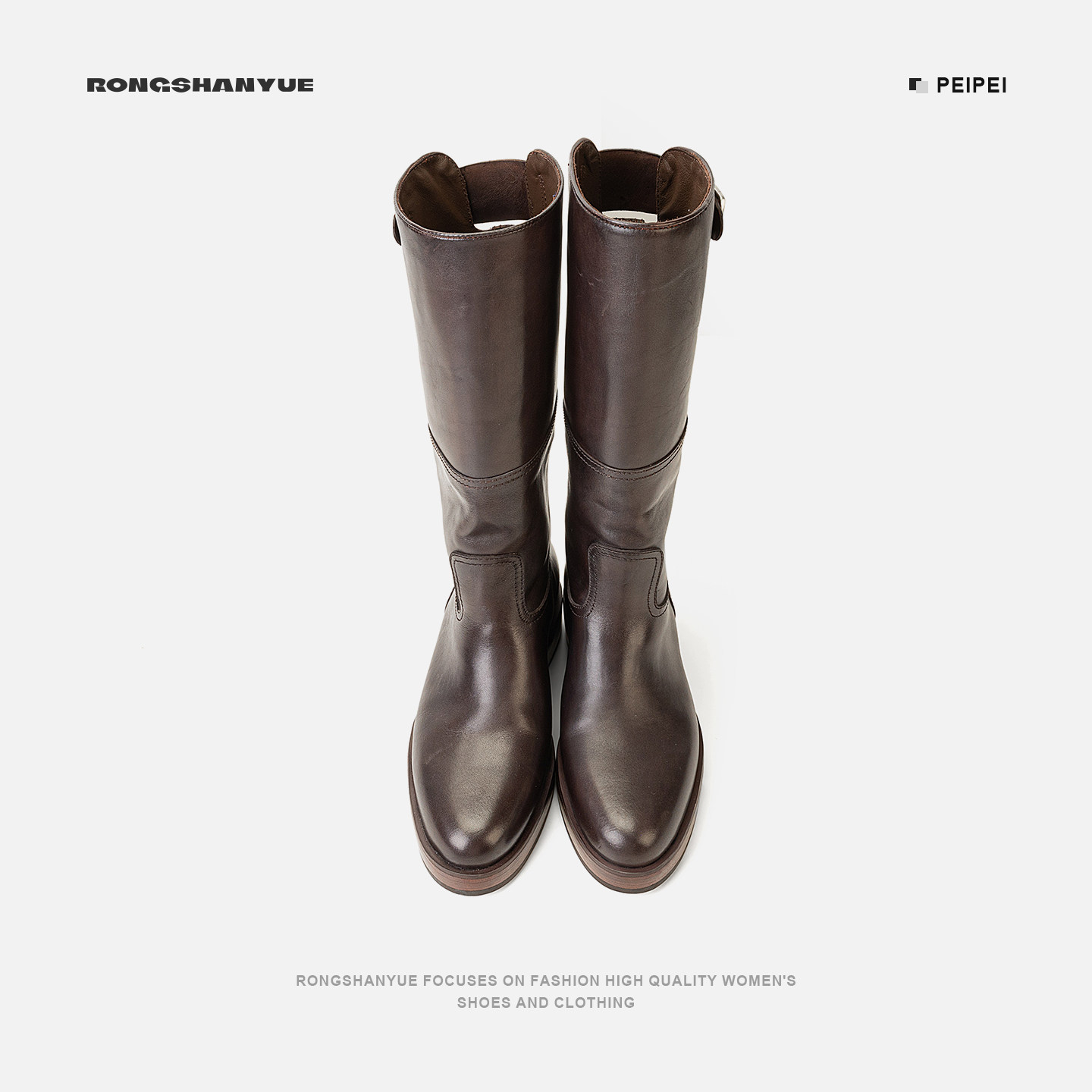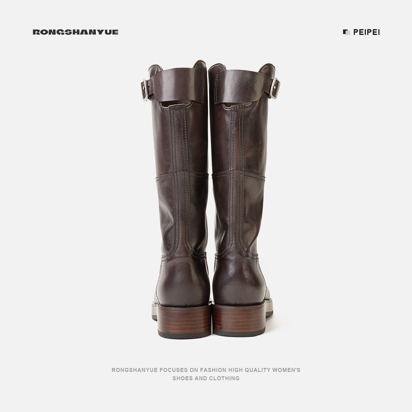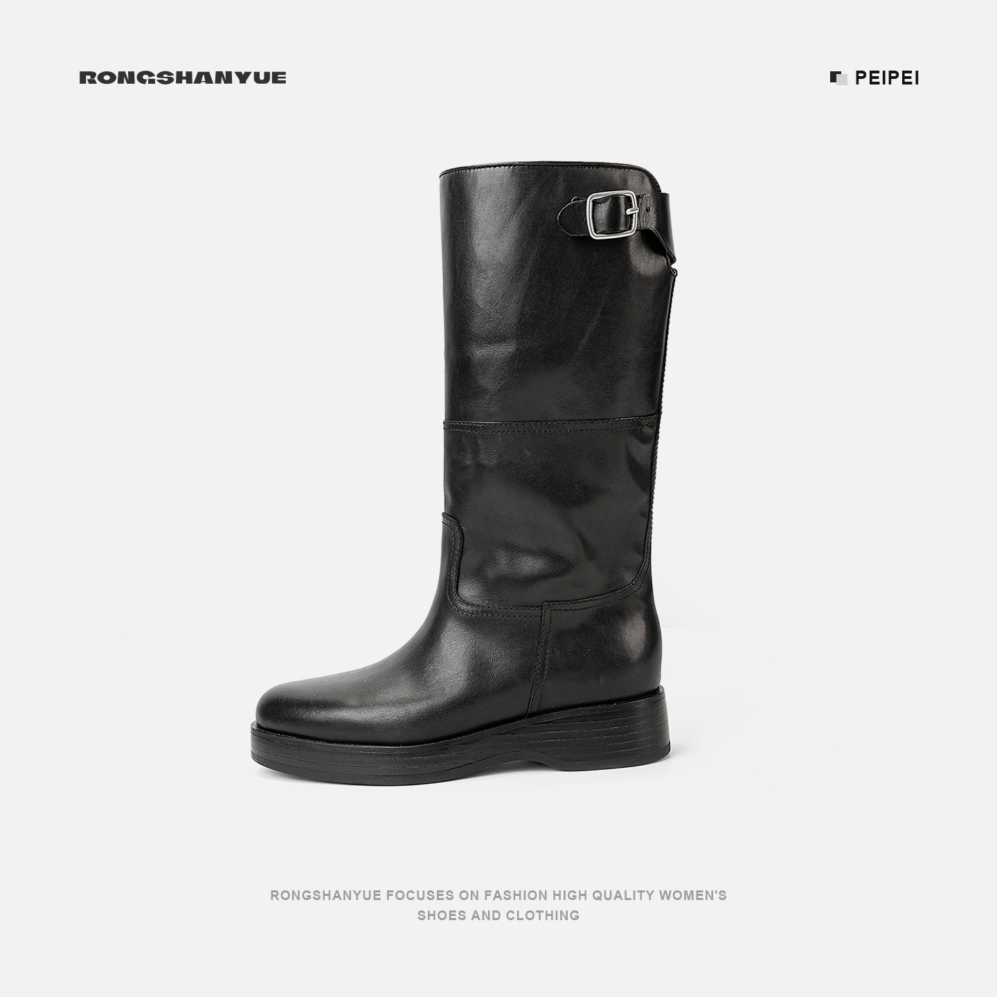 Rongshanyue甄选牛皮粗跟长筒靴套筒皮带扣厚底秋冬靴子B1429