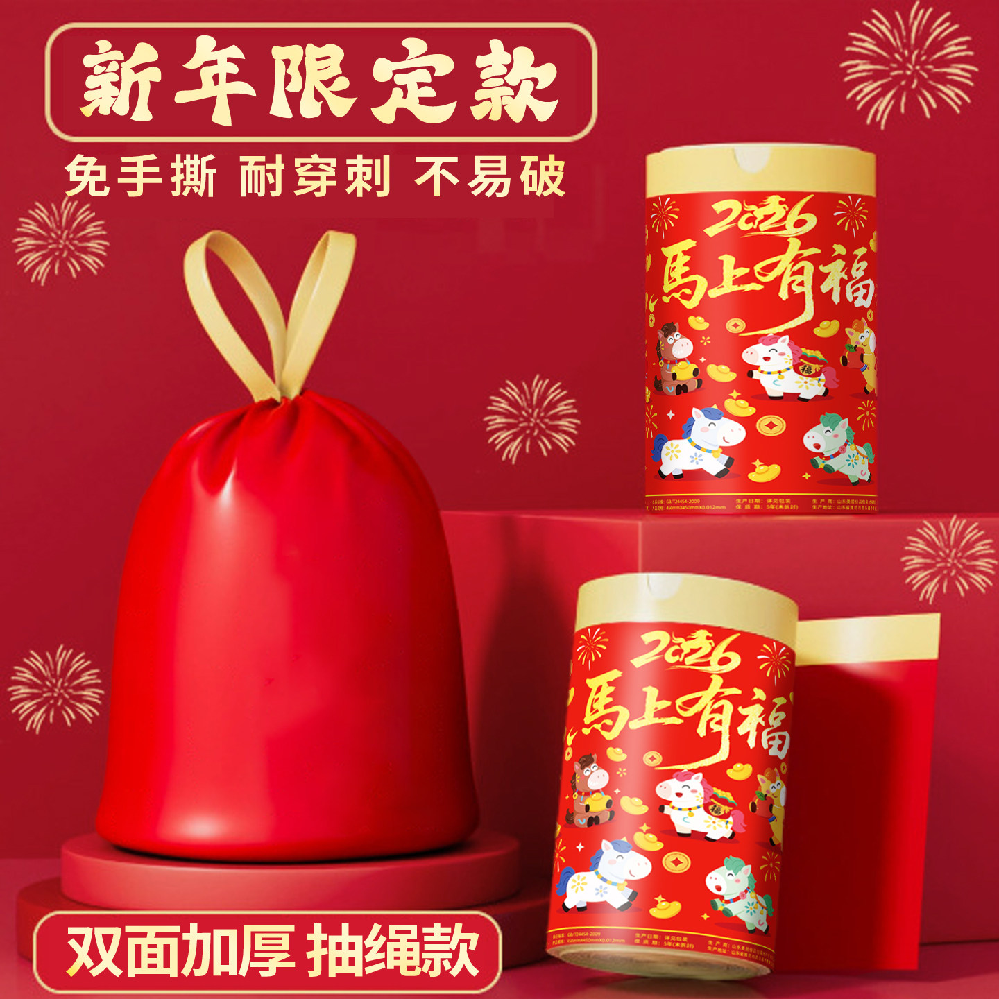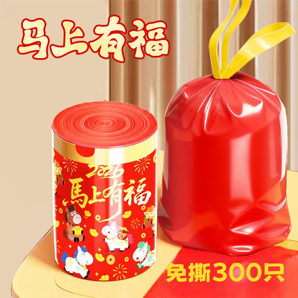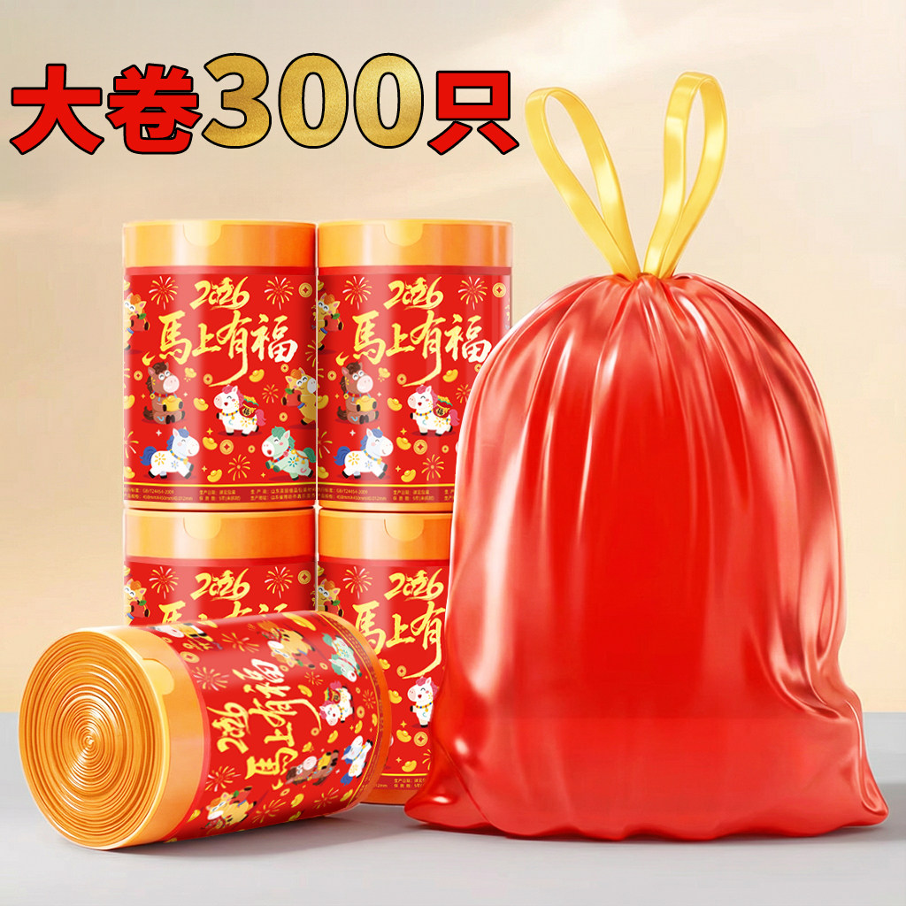 新年红色垃圾袋家用加厚手提式免撕大号抽绳超厚厨房用马年清洁袋