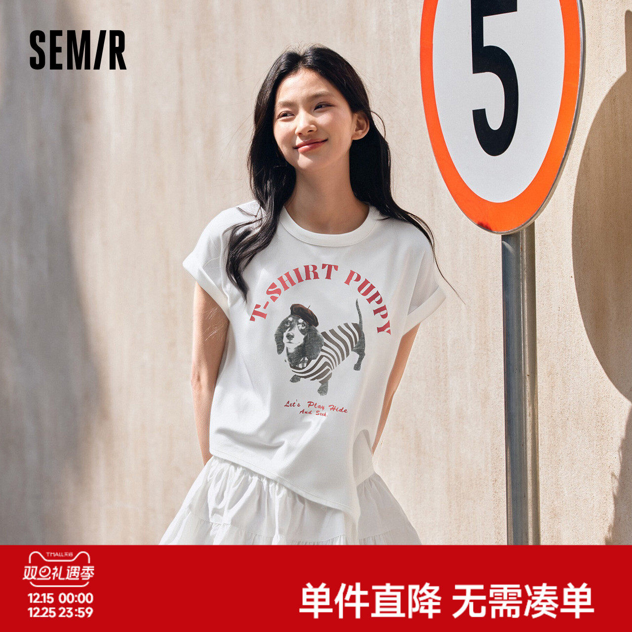 森马T恤女连肩袖宽松小心机绑带小众2025夏新款个性小狗上衣趣味
